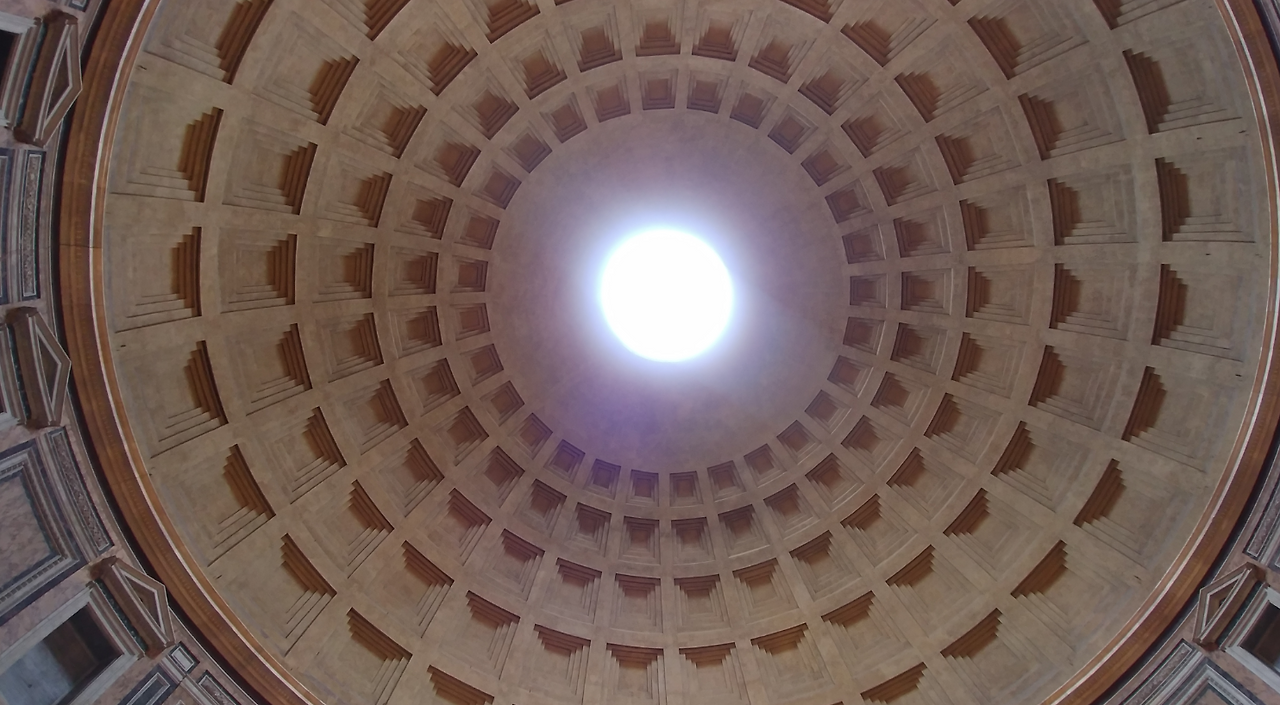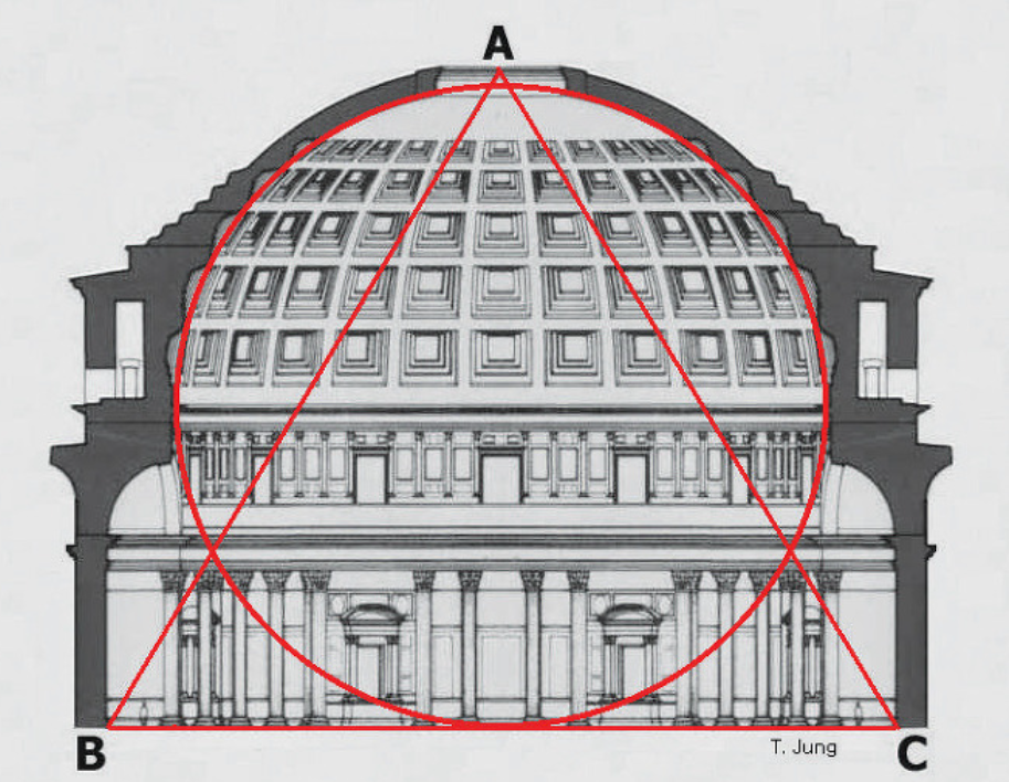 판테온 신전은 천체와 우주를 상징하도록 설계되었고 꼭지점을 이으면 완벽한 정삼각형을 이룬다고 한다(건축학자 정태남님 설명과 자료)