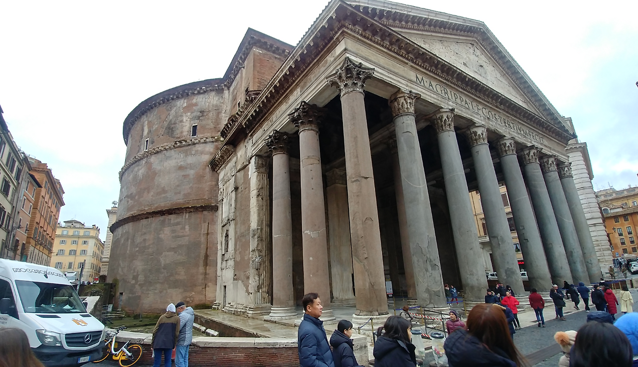가장 먼저 이동한 곳은 판테온 신전이었다. 판테온은 판(모든)+테(신)+온(장소)란 의미로 로마가 그리스도 국가가 되기 전에 수많은 신을 모신 곳이었다는데 지금은 성당으로 활용하니 유일신을 모시는 장소로 용도가 바뀐 셈이다. 기원전 27년 아그리파가 처음 세웠고 화재로 AD125년에 새로 세웠다고 하는데 그렇더라도 1900년 가까이 된 건물인 셈이다.