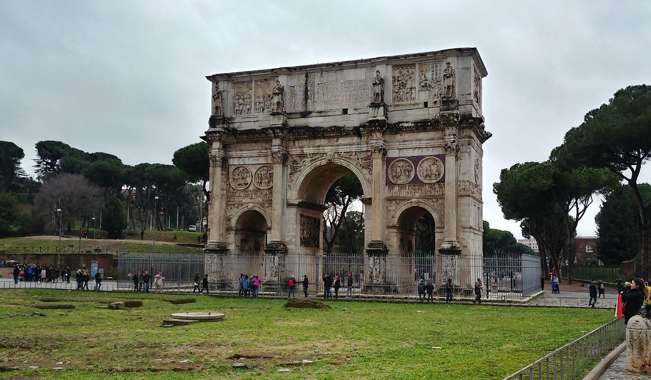 콜로세움을 지나 나타난 건축물은 개선문이었다. 로마에는 여러 개의 개선문이 있단다. 콜로세움 옆에 있는 이 개선문이 콘스탄티누스 1세가 서로마 통일 기념으로 세운 것이고, 또 하나는 우리가 마주하는 개선문에서 좀 떨어진 곳에 보이는 개선문인데 티투스황제 개선문이라 한다. 나머지는 포로 로마노에 있는 아우구스투스와 세베루스황제의 개선문이다. 이곳 콘스탄티누스 개선문에 영향을 받은 것이 프랑스 파리의 개선문이라 한다. 황제들이 전쟁에서 이기고 돌아올때 통과했다는 했다는 이런 건축물은 당시에 시민의 사기를 높이고 국가의 자부심을 위해 만들었다는데 이런 건축물을 만들면서 힘들었을 시민들을 생각해 보면 특권층의 사기와 자부심이 아니었을까 하는 생각을 해보게 된다.
