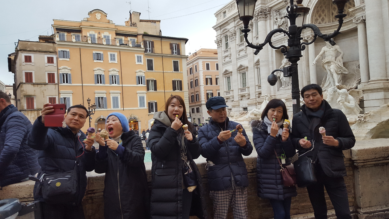또 하나의 로마의 상징이라는 트레비 분수로 갔다. 트레비는 세 도로에 있는 분수란 의미란다. 모두들 생각보다는 적은 분수라고 했는데 내 머리 상상속의 규모와는 비슷했다. 분수에서 동전을 던지기에 앞서 주위 가게에서 이탈리아 아이스크림 본젤라또 맛을 보기로 했다. 하나당 3유로 정도 하는 아이스크림을 하나씩 입에 물고 분수 앞에서 일행들과 포즈를 취했다. 많이 달지 않고 먹을만한 아이스크림이란 생각이었다.
