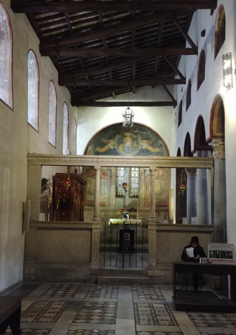 다음 가이드를 따라 이동한 곳은 그리스정교 성당 한쪽 벽에 걸려있는 진실의 입이라는 상징물로 갔는데, 비수기이고 운이 좋아 줄이 많지 않았다. 가이드의 말에 따르면 성수기에는 이 진실의 입에 손을 넣기 위해서도 몇 시간을 기다려야한다고 했다. 진실의 문 조각은 하수구 뚜껑이었는데(확인된 바는 없다고함) 이것에 손을 넣었을때 거짓말을 할 경우 손이 잘린다는 전설이 있는데, 중세 일부 영주들은 실제로 사람들에게 손을 넣게 해서 손을 잘랐다는 이야기도 전해진다고 한다. 우리 순서가 되어 두 사람이 같이 손을 넣고 아픈 표정으로 그리고 즐거운 표정으로 사진을 남기고 안의 성당으로 들어 갔다. 성당에 들어가자 바로 왼편에는 어떤 분의 무덤이 있었는데 그가 바로 2월 14일을 기념하는 바렌타인 신부의 무덤이란다. 그리고 연결된 성당을 관람했는데 그리스 정교라서 그런지 분위기가 일반 성당과는 사뭇 달라 몇 컷의 사진을 남겼다.