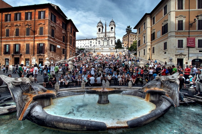 벤츠를 타고 다녔지만 걷는 거리가 만만찮다. 차량을 이용하지 않았으면 후회할 뻔... 이렇게 바삐 관광을 하고 도보로 관광하는 팀과 만나기로 한 장소로 갔다. 그곳은 스페인 광장이었다. 스페인 대사관이 자리잡은 이후로 스페인광장이란 이름이 붙여졌는데 이 광장과 계단은 영화 '로마의 휴일'에서 오드리햅번이 걸어내려 오면서 더욱 유명세가 붙었다고 한다. 헤어졌던 일행들이 광장 분수가에 앉아 쉬고 있었는데 과거에는 이곳에서 본젤라또 아이스크림을 즐겼으나 거리가 더럽혀지는 바람에 현재는 금지되었다고 한다.