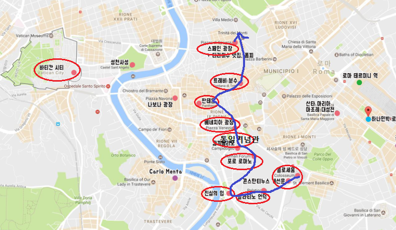 오전에 바티칸을 보고 오후 로마 시내 관광에 나섰다. 이탈리아의 수도이고 도시 전체가 관광지라는 로마, 오후에는 다행히 비가 그쳐 관광하기에 좋았다. 밴츠투어를 택하지 않은 일행은 걸어서, 우리들은 카니발과 비슷한 벤츠 차량에 탑승해서 투어를 시작했다. 결과적으로 밴투어를 택한 것이 걸으면서 관광하는 것보다는 좀 더 많은 관광지를 보게 되어 나쁘지 않았던 것 같다.