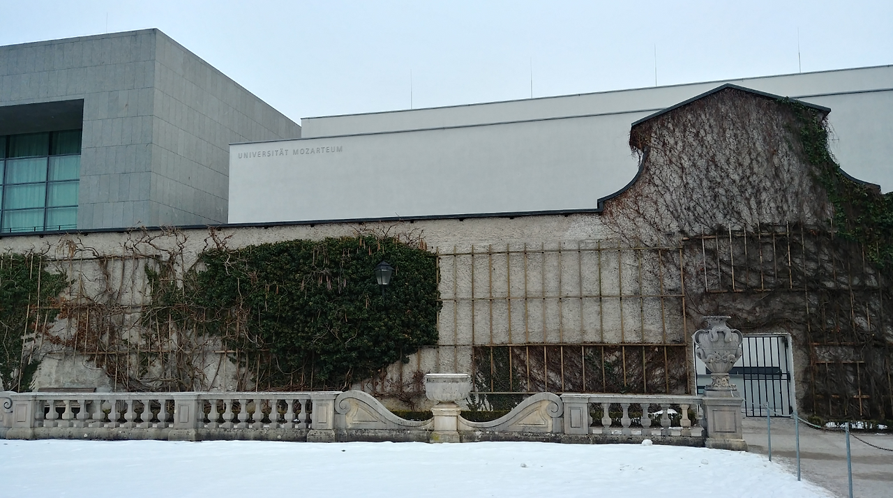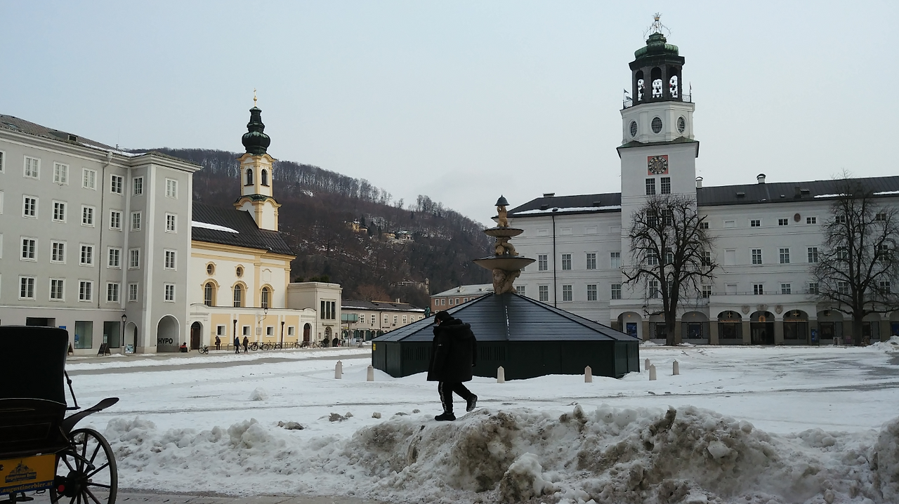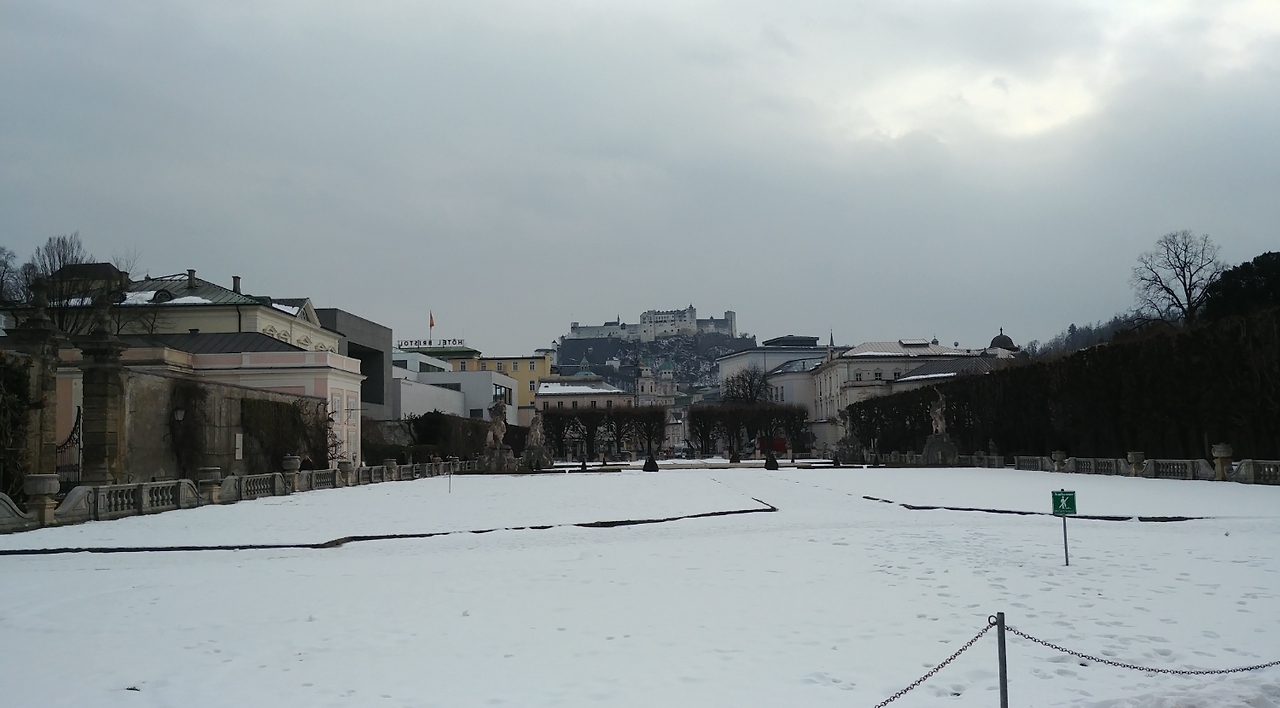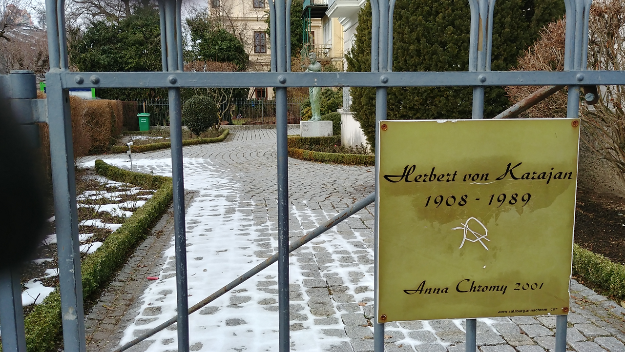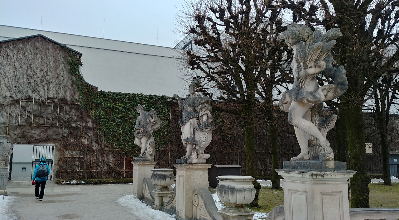 그리고 이동하면서 조수미를 발굴해서 세계적인 소프라노로 키운 카라얀의 생가라는 곳을 향해 사진을 남기고 사운드오브뮤직에서 도레미송을 부른 주 무대 미라벨 정원으로 갔다. 정원 입구에는 모짜르트가 청년기를 보냈다는 집이 다시 나타나 기념사진을 찍고 정원 안으로 들어갔다.(이곳은 모짜르트 빼면 설명이 안된다. 모짜르트 광장도 있다는데 우리 일정에 없었다.) 정원에 들어가니 넓게 트인 곳이 나타났는데 눈으로 덮혀 있지만 아름다운 곳임을 한 눈에 알 수 있었다. 다양한 조형물이 문을 지키는 형태로 좌우에 그리고 곳곳에 배치되어 있었다.