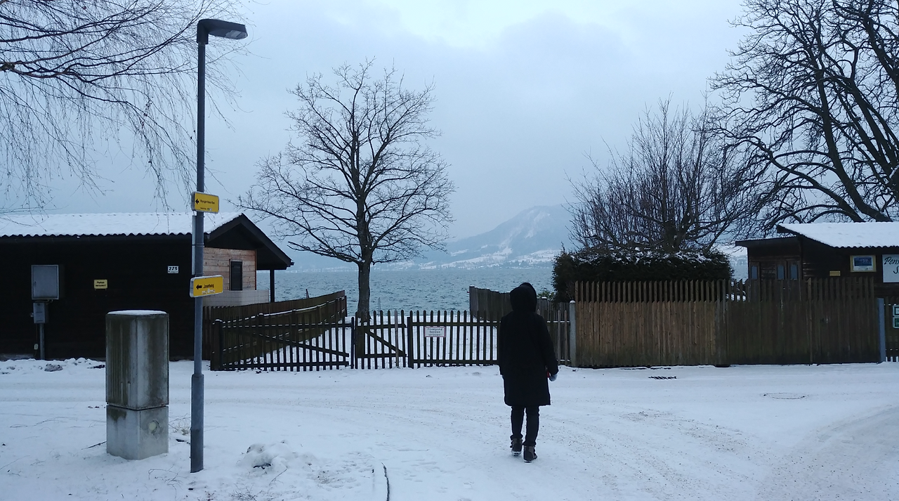 3성급 호텔이었지만 지금껏 머물렀던 최고의 호텔에서 따뜻한 하루를 보내고 아침 출발시간도 느긋한 가운데 지금껏 최고의 아침식사를 하고 산책을 나섰다. 거대한 호수를 낀 선진국 마을은 어떨까? 눈도 조금씩 내리고 거리는 온통 하얀색으로 덮혀있는 마을길을 따라 호수 인근으로 다가 갔다. 독일어로 쓰여진 글을 보며 어떤 건물일까를 짐작해가며 사진도 남기며 걸었다.