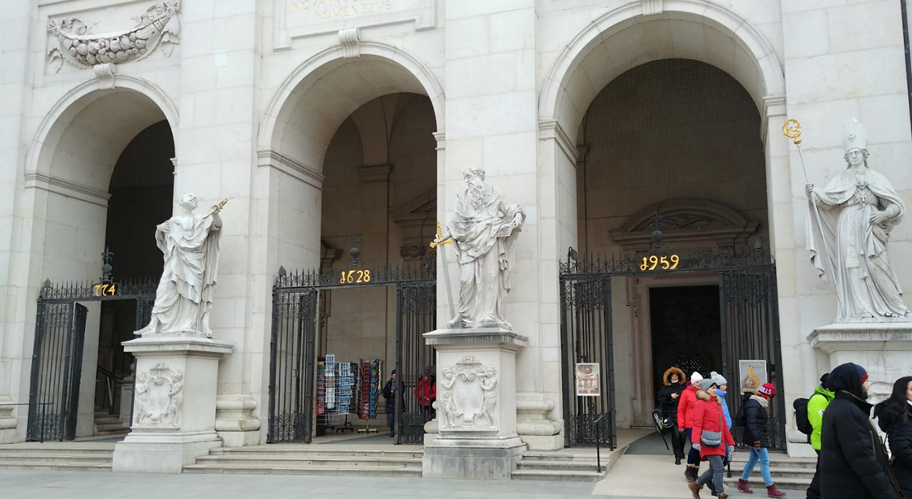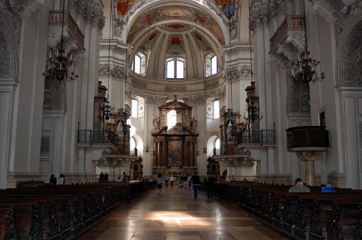 성당 높이가 85미터 높이의 규모였는데 성당 문을 닫혀있어 외부 성당벽에 대한 설명을 상세히 들었다. 맨 위 예수님 상을 비롯해 내려 오면서 모세 사복음서 그리고 베드로 바울과 같은 분드의 조작이 새겨진 모습을 볼 수 있었다. 성당 앞에 새겨진 세 숫자가 인상적이었는데, 774는 처음 설립한 년도이고, 1628은 화재후 다시 지은 년도. 1959 2차대전후 다시 설립한 년도를 의미하고, 모짜르트가 이 성당에서 세례를 받았다고 한다.