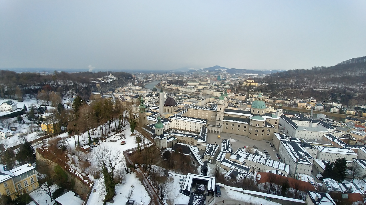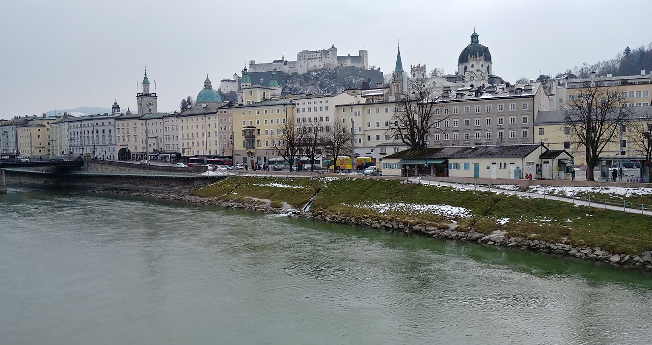 가이드분은 목소리가 아주 이쁘고 또렷한 분이었다. 우선 버스에 내려 주욱 둘러보니 멀리 호엔잘츠부르크성이 높이 보였고 우뚝 솟은 둥근 성당이 보였다. 어디나 예쁜 성당이 우리를 반긴다. 이 조그만 도시에도 성당이 25개나 있다고 한다. 이곳 날씨는 우리가 기상대에서 알려주는 온도와는 느낌이 다르다. 공기가 맑고 높은 지대에다 습기를 머문 공기라 체감온도는 더 춥게 느껴진다고 했다. 이날도 -3도 정도였으나 체감온도는 훨씬 더 춥게 느껴졌다.