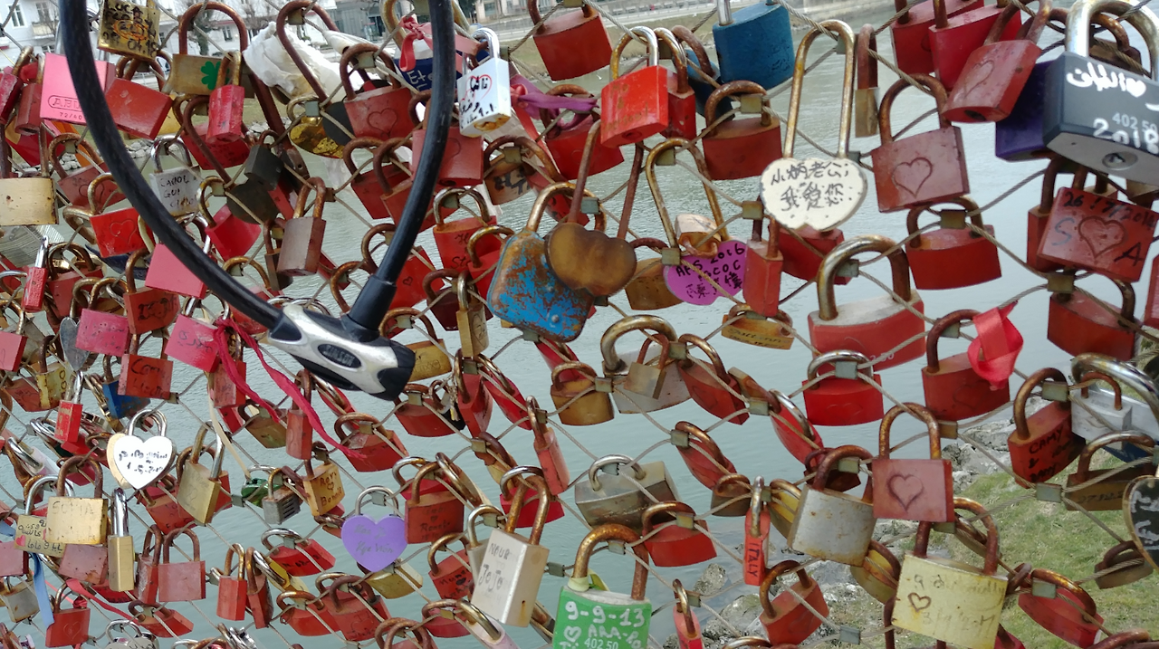 골목을 벗어나 잘츠흐라는 이곳 강을 가로질러 신시가지로 이동했는데 다리에는 열쇠뭉치가 빼곡하게 채워져 있었다. 자물쇠를 채우고 열쇠는 다리 밑에 던져버리는데 이것의 녹물 때문에 환경문제가 되고 있다는 설명이 있었다. 다리(마카르트 다리)를 건너서 구시가지를 보니 우리가 다녀왔던 성과 성당의 모습이 한 눈에 들어와 다리 끝에서 시가지를 향해 몇 컷을 남겼다.