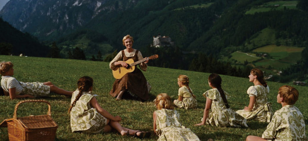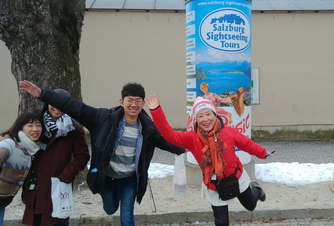 들어가면서 우측 흰벽 건물에 쓰여진 음악대학은 모짜르트 음악대학이라고 했고 정원에서는 사운드오브뮤직에서 아이들이 오르내리던 계단을 먼 거리에서 볼 수 있었다. 미라벨 정원 끝과 연결된 이곳 시청사라는 곳에서 사진도 찍고 나와 점심장소로 가기 전에 사운드오브뮤직 1965년에 나온 영화 포스트를 향해 뛰는 모습으로 기념 사진을 남겼다.