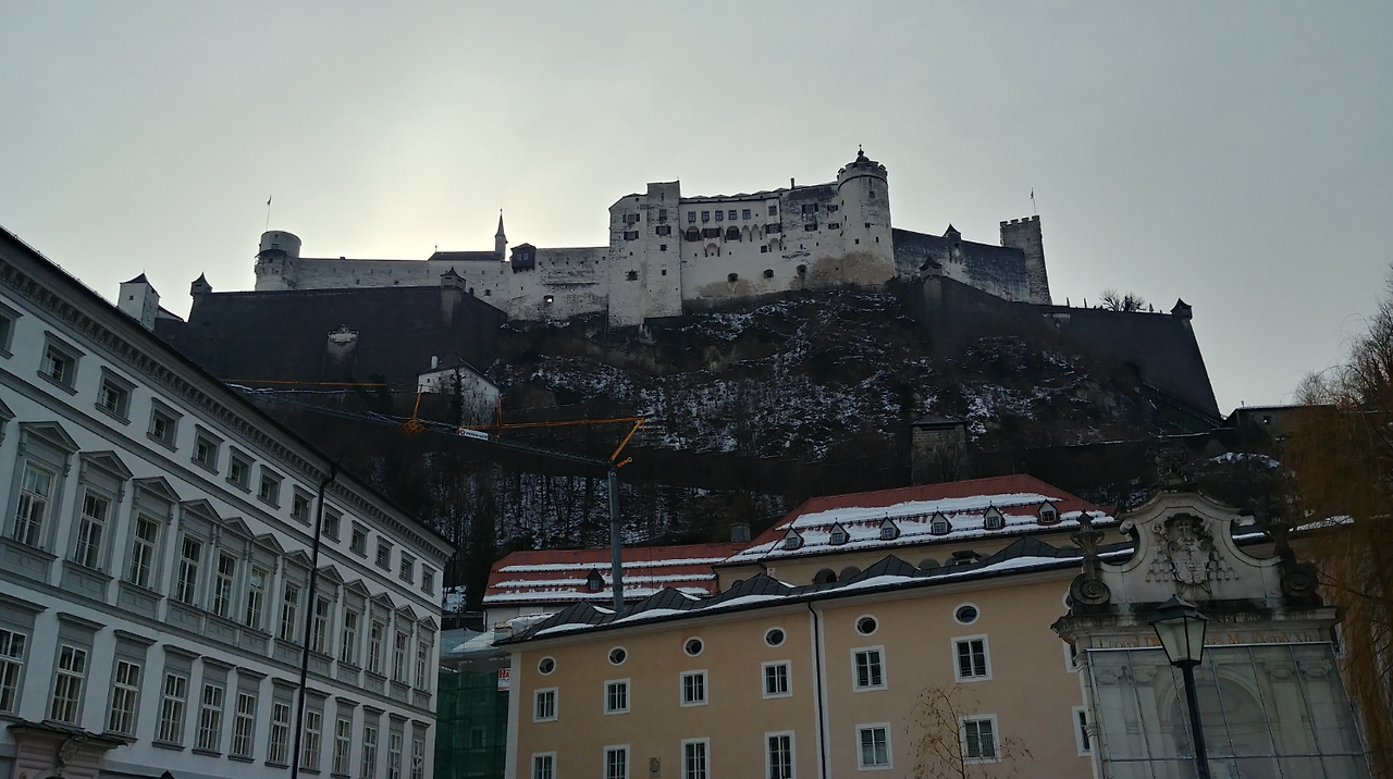 처음 간 곳은 호엔잘츠부르크성이다. 1077년에 건립하기 시작하여 580년 동안 지은 성이고 지금도 늘 보수중이란다. 높다랗게 보이는데 30분 이상 걸리는 거리를 걸어서 가는 것이 아니라 성까지는 푸니쿨라(언덕을 따라 올라가는 케이블카의 한 종류)를 이용해서 1분 정도만에 올라가는데 비스듬한 엘리베이터 같은 탈 것이었다. 그렇게 해서 올라가니 잘츠부르크가 한 눈에 들어온다. 이 성은 평소에 사용하는 성이 아니라 적이 쳐들어오면 피신을 하기 위해 사용한 성이라고 했다.