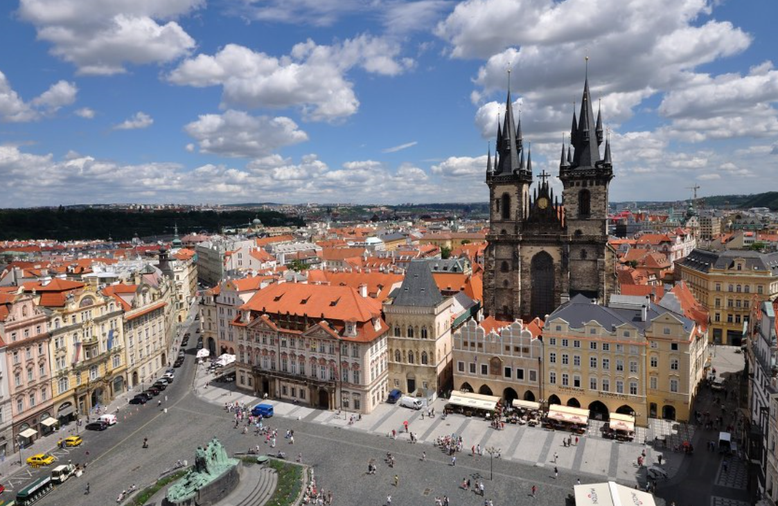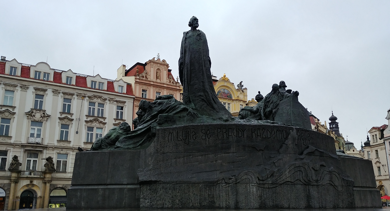 광장 중간에는 그의 순교 500주년(1915년)에 세워진 이 나라 국민 영웅 얀 후스 동상이 커다랗게 자리잡고 있었다. 얀 후스는 루터보다 100년 앞서 종교개혁(당시 이 지역 토지의 80%가 성직자 소유)을 주창한 사람으로 체코어를 쓰는 사람 중심의 민족주의 개혁을 앞장선 사람이라 이 곳 사람들에게는 국민적 영웅으로 추앙받고 있었다. 잘못을 인정하면 풀려날 수 있었으나 거절하여 화형 당했다고 한다. 이 사건을 계기로 농민들이 봉기하여 기독교 군대와 전쟁을 하게 되고 결과적으로는 개혁지도자 27명이 이 광장에서 단두대에 처형당하게 된다고 한다. 광장바닥에 그 십자가 표시를 해서 기념한다고 한다. 얀 후스 동상에는 "진실을 사랑하고, 진실을 말하고, 진실을 지켜라"라고 새겨져 있다.