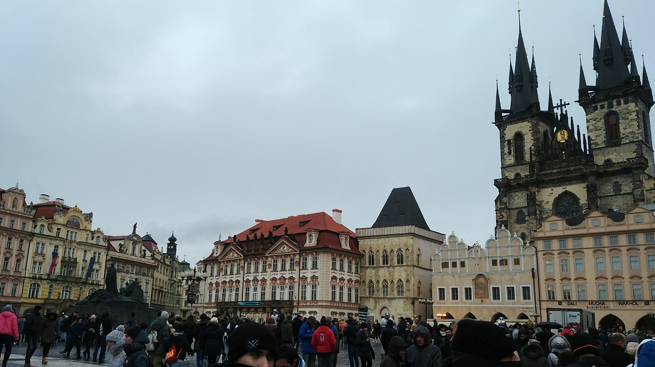 천문시계를 보고 나서 바로 큰 광장과 뾰족하고 거대한 첨탑 2개를 맞았는데 비가 내리는 가운데도 시커먼 첨탑은 광장 분위기와 멋진 조화를 이루었는데 틴교회라고 한다. 그 첨탑은