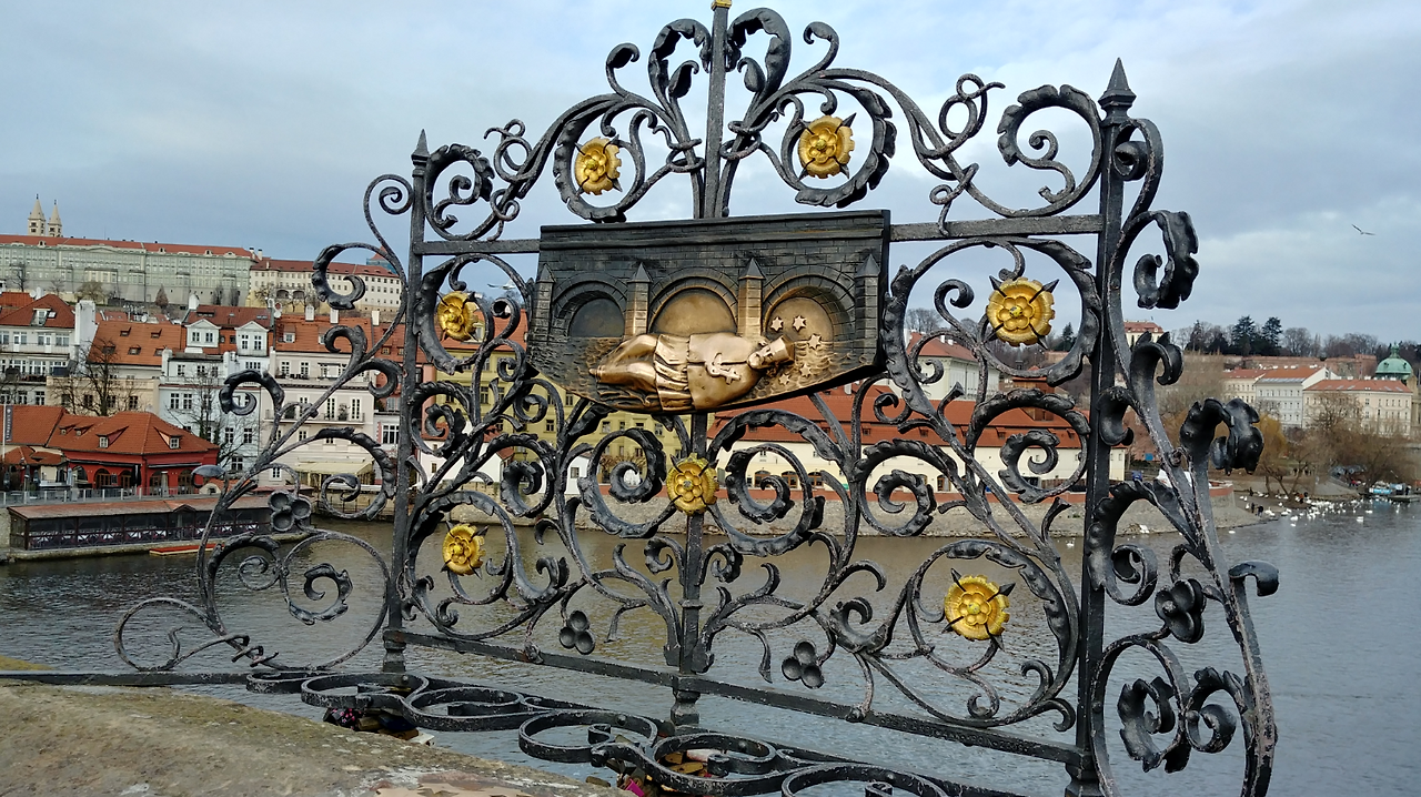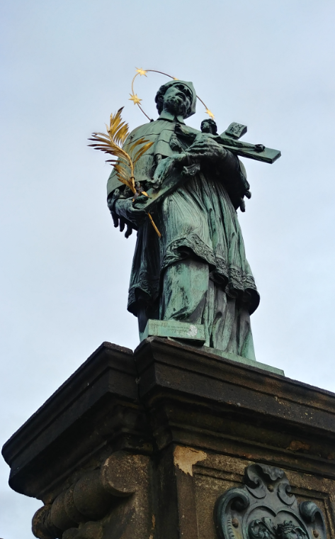 네포목주교는 당시 황실에서 왕비의 고해성사 내용에 대한 비밀을 지키다가 이 다리 위에서 떨어져 순교하게 되었는데 그 동상 밑에서 소원을 빌면 이루어진다는 전설 때문에 사람들이 하도 만져서 동판이 반짝반짝 빛나고 있다. 빠진 곳에서 다섯 줄기의 빛이 나왔다해서 머리 위해 5개의 별 모양을 달았다고 한다.