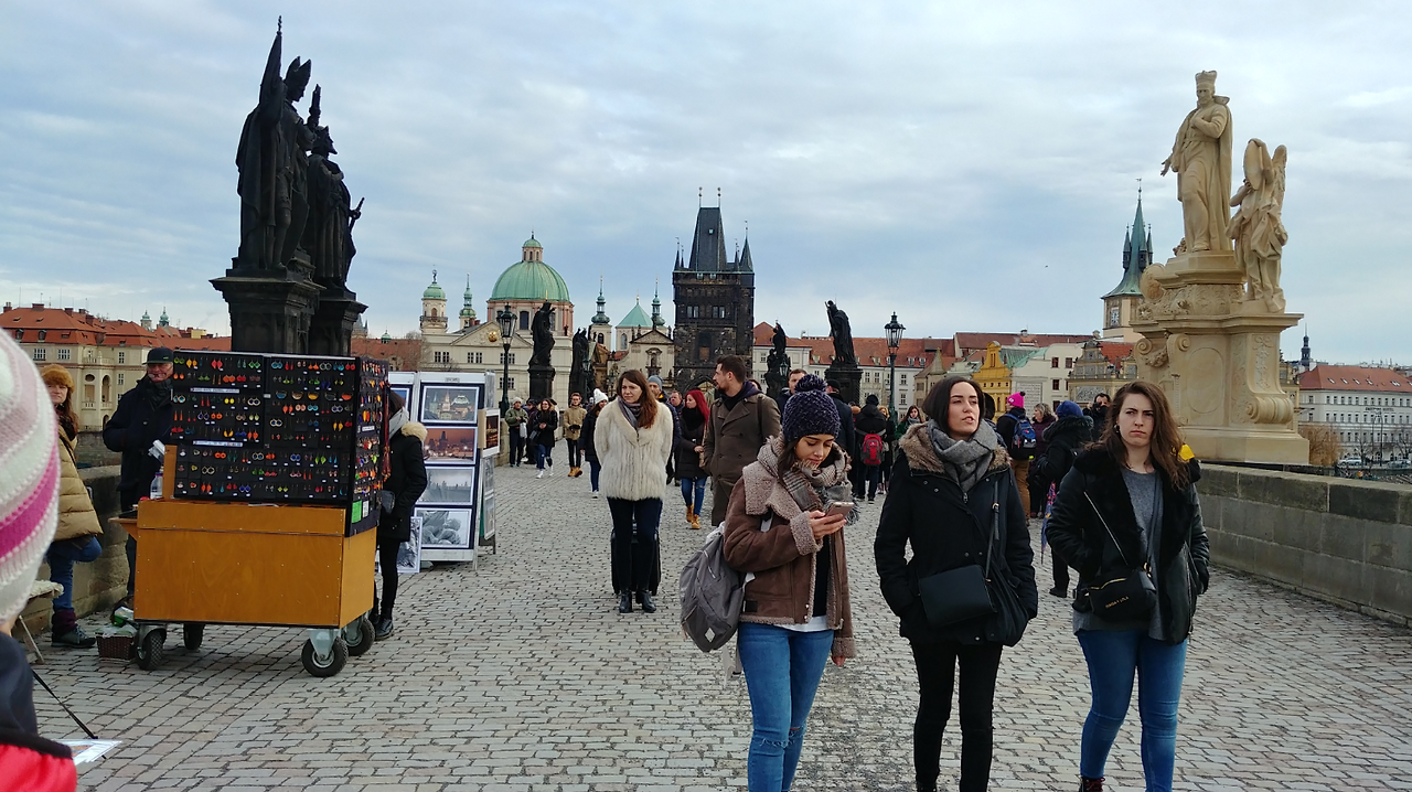 까를교는 첫날 저녁에는 약간의 비와 함께 바람이 불어 추워서 야경을 관람하는데 급급했지만 다음 날 밝은 까를교를 다시 보며 찬찬히 관광할 수 있었다. 블타바 강을 잇고 이 있는 멋진 이 다리는 까를 5세에 의해 15세기 초에 세워졌다고 한다. 길이는 500여미터에 폭이 10미터 정도 되는데 다리 위에 30여개의 조각상이 멋지게 놓여 있고 그 중 하나가 잘츠부르크에서 가이드가 기억하라고 얘기했던 네포목 주교의 동상이었다.