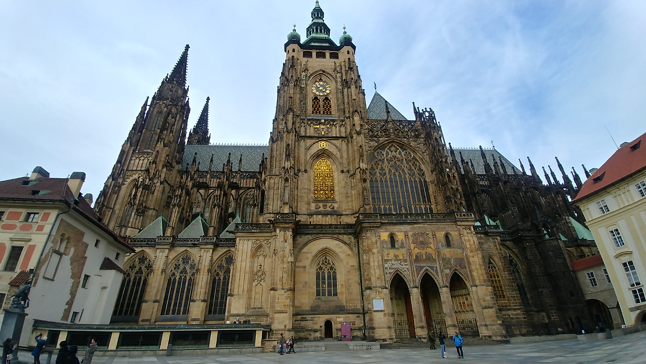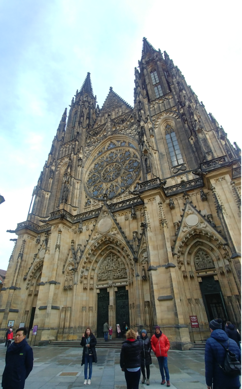성 안으로 들어가니 거인상이 나오는데 이것은 그리스 신화에 나오는 '싸우는 거인들'이라는 작품이라고 한다. 그리고 안으로 들어가 용도는 모르지만 우물처럼 생긴 것을 보고 난 뒤 고개를 드니 이곳 비트(비투스) 성당이 눈에 들어왔다. 아쉽게도 비트 성당 오픈이 11시라 관람을 포기하고 웅장한 외부 건물만 카메라에 담았다. 체코를 대표하는 성당으로 르네상스, 바로코, 고딕 양식이 시대를 거치면서 각종 양식이 혼재되어 나타나는 건물이라 한다. 길이 124m, 폭 60m, 높이 33m의 규모로 첨탑의 높이만 100m에 이른다. 다른 성당과 마찬가지로 이곳도 왕, 귀족 등의 공동묘지인데, 체코 최고의 성당이름으로 비투스 성인이름을 쓴 것은 비투스란 성인이 대단한 사람인가 보다 하고 자료를 찾아보니 BC 313년에 순교한 성인으로 보면 되겠다.