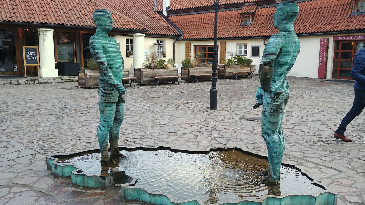 프라하성에서 내려오다가 카프카 기념관을 만났다. 카프카는 유태계도 독일어로 작품을 남겨 독일인으로 알고 있는 경우가 많다는데 이곳 체코 출신이라 한다. 카프카의 변신은 우리 모두 알고 있는 그의 유명한 작품이다. 37세에 요절한 카프카가 보헤미안 쪽에 유명하다면, 모라비아 쪽에는 참을수 없는 존재의 가벼움을 쓴 밀란 쿤테라라 유명하단다. 아래 흉칙한(?) 무기를 자랑하는 조형물은 카프카 기념관 마당에 서 있다.