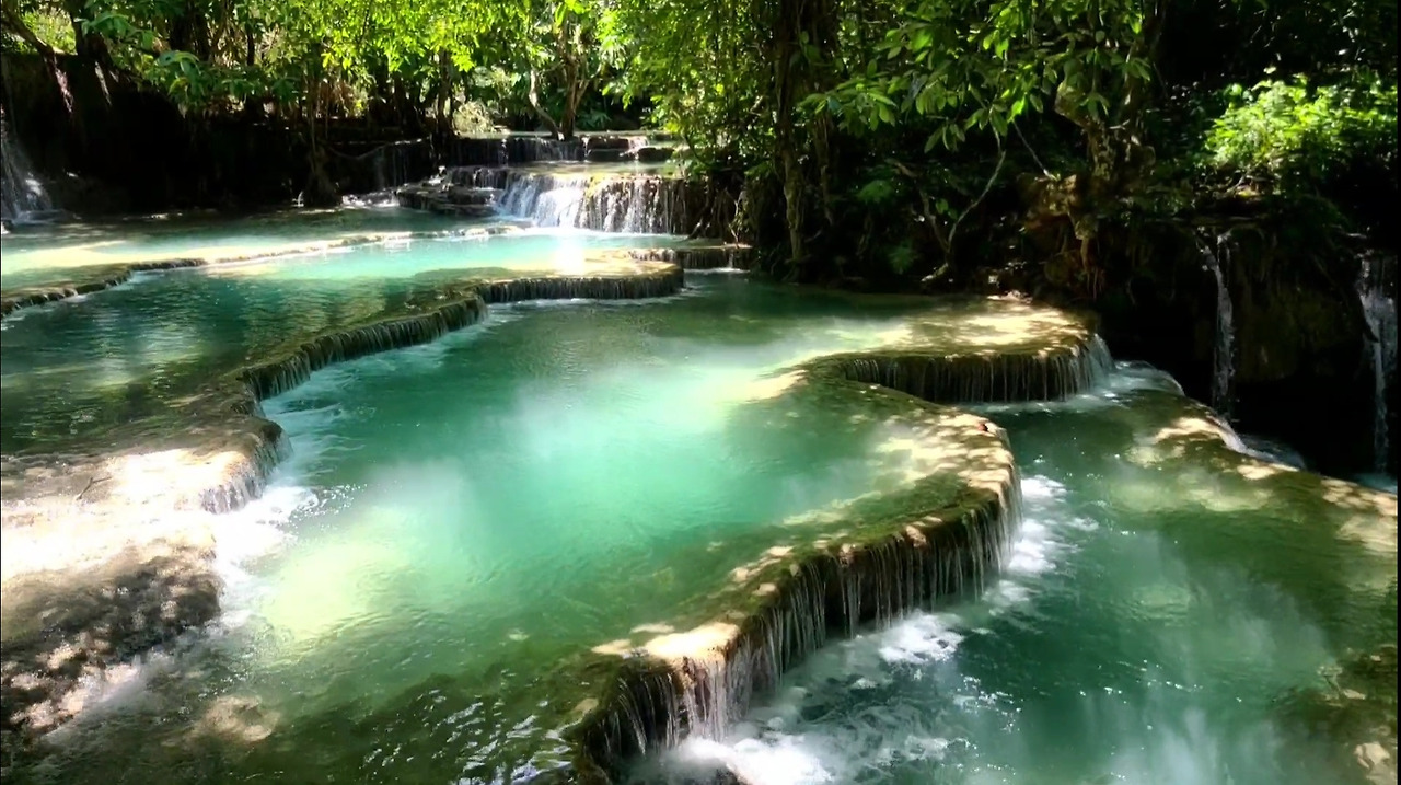 꽝시 폭포는 사슴이 파헤친이란 의미라 한다. 꽝시 폭포 맨 위에 사슴 조형물이 아마도 그 의미를 표현하는 것이 아닌가 생각했다. 입구는 우리 나라 지리산에서 의도적으로 키우고 있는 반달가슴곰을 사육하는 곳부터 시작된다. 꽝시 폭포로 올라 가는 동안 좌우 멀찌감치 떨어진 곳에서 반달곰이 우리는 반긴다. 조금 더 울창한 숲을 지나면 7단계로 구성된 1단계 옥빛의 꽝시 폭포가 자태를 드러낸다. 빛이 반사되어 눈부신 계단식 자연 폭포가 밀림과 함께 잘 어우러져 있다. 마치 아담과 이브가 나체로 몸을 드러낼 것 같은 느낌을 갖게 된다. 실제 서양에서 온 청년들은 하얀 살갗을 드러내고 옥빛 물 속에 몸을 담긴 채 유유히 수영을 즐기고 있었다. 그렇게 매 단계마다 다양한 모습의 옥빛 꽝시 폭포는 맨 마지막 제일 높은 단계에서 절정을 이뤘다. 아래 단계에서와는 차원이 다른 높이에서 여러 모양으로 물을 뿜어내고 있었다. 마치 사람들이 의도적으로 예쁘게 모양을 낸 폭포의 물줄기란 느낌이 들 정도.
