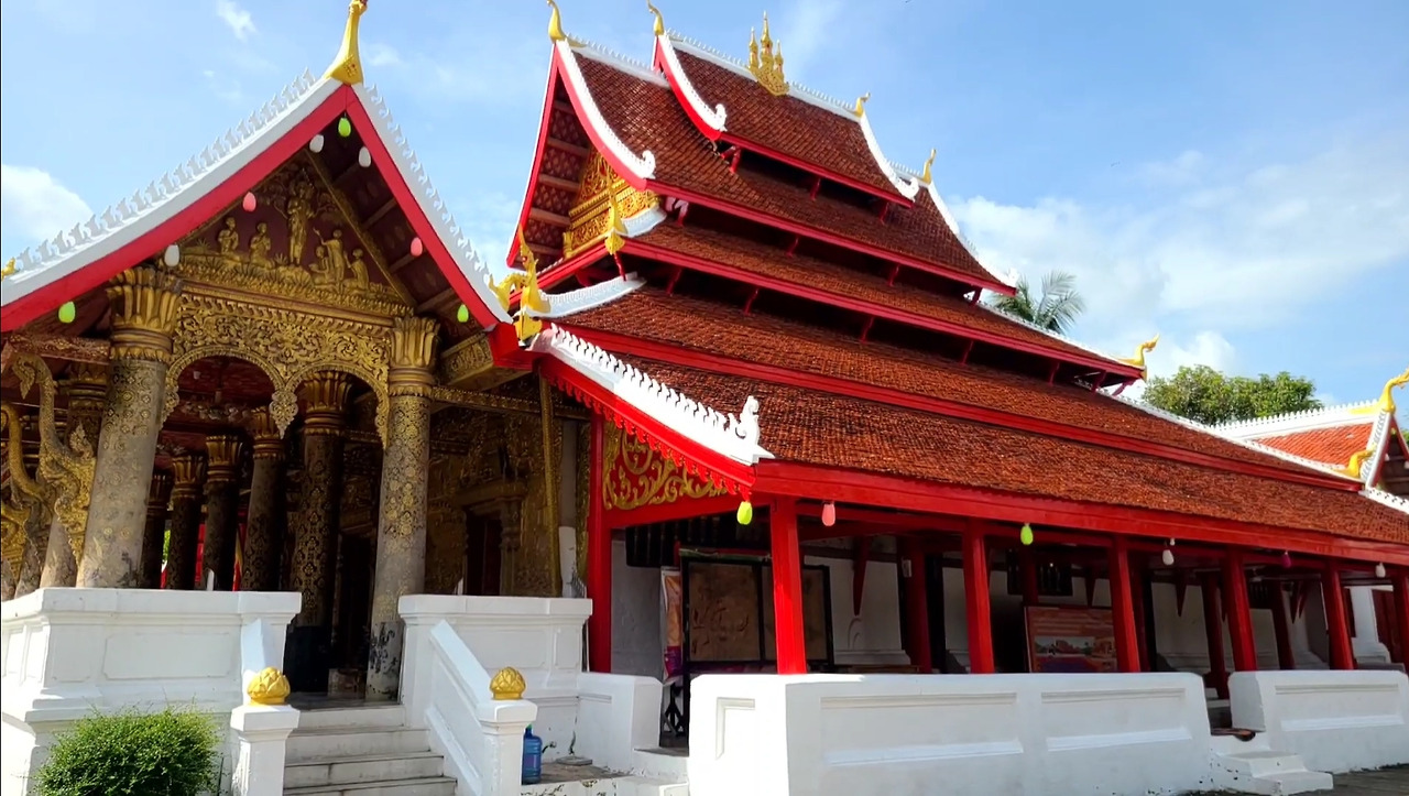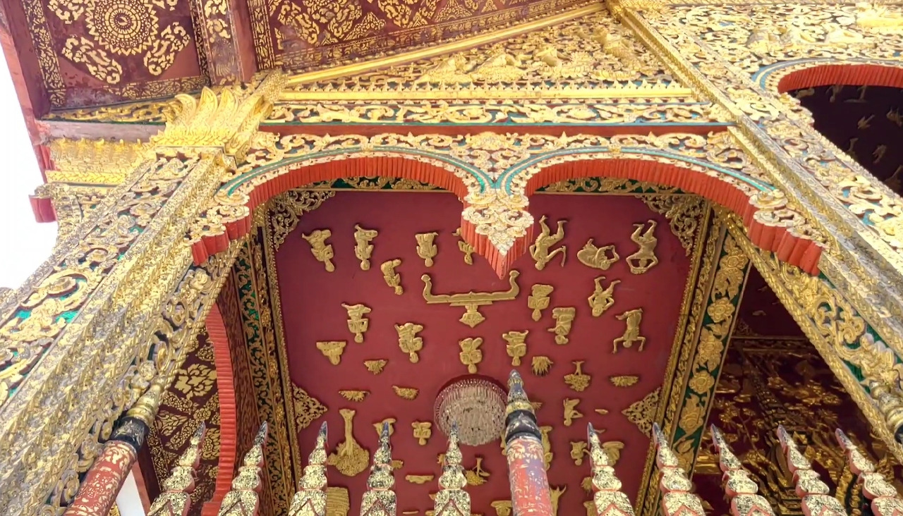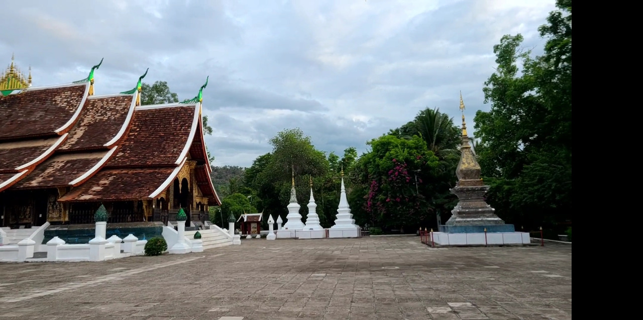다음에 간 곳은 왓 마이 사원으로 이곳 말로 새로운 사원이란 뜻인데, 옆에 있는 왕궁(지금은 왕궁박물관)에서 전용으로 사용했던 사원이라 한다. 왓마이 사원을 들어서면 제일 먼저 눈 앞에 세월이 흔적이 그대로 느껴지는 멋진 불탑들이 있는데 18세기에 지어진 것이라 한다. 불탑 옆에는 돌아가신 분(아마 권력자였을 듯)들의 영정사진들이 비치되어 있었다. 왓 마이 사원의 지붕도 왓 씨앵 통의 지붕처럼 다겹의 지붕으로 이루어져 있었고, 지붕 끝에는 나가(불교 신화동물)로 장식되어 있었다. 70년에 걸쳐 새롭게 지었다해서 아마도 새로운 사원(와 마이)이라는 이름이 붙었을 것으로 생각된다. 라오스에는 새해에는 3일간 대규모 축제 행사를 하는데 4월 14일~4월 16일 기간(이때가 이곳의 새해라고 한다.)에 열린다. 이때 왕궁에 있던 프라방을 이곳에 옮기는 행사를 하는데 프라방은 90%가 순금으로 되어 있는 불상으로 옆에 있는 왕궁에 모셔져 있었다. 기둥은 금색으로 장식되어 있었고 부처의 일생이 그림으로 새겨져 있었다. 문틀도 금으로 장식되어 있었고 사원 내외벽은 붉은 색과 검정색으로 되어 있었다.