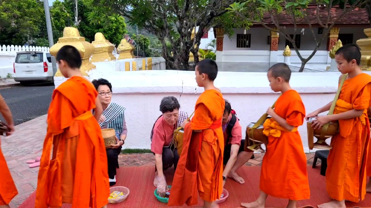 다음 날 새벽, 특별한 행사에 참여하기 위해 일찍 나섰다. 어찌보면 이걸 보기 위해 여기 왔을지도 모른다. 붉은 주홍빛의 가사를 입은 승려들의 탁발행렬! 노승에서 동자승까지 줄지어 세상 사람들로부터 그들의 육의 양식을 얻는 과정이다. 라오스는 다른 사회주의 국가와는 달리 불교를 국교로 하고, 국민의 90% 정도가 불교를 믿는다고 한다. 그래서인지 승려들은 이곳에서 존경받는 직업에 속한다. 탁발과정은 승려들의 수련 과정에 속한다. 상좌불교의 특징은 수련을 통해 자신을 구원하고 해탈하여 영생을 얻는 것이다. 무소유를 실천하고 필요한 만큼만 얻어 생활하는 것이다. 이 과정을 통해 불자들은 보시에 참여하는 기회를 얻고 이렇게 공덕을 쌓아 자신이 원하는 모습을 태어나기를 기도하는 것이다. 스님들은 탁발을 통해 얻은 것을 필요한 것만큼만 사용하고 나머지는 다시 어려운 사람들에게 나눠준다고 한다. 3달러를 내면 탁발에 참여할 수 있는데 찰쌀밥과 과자가 담긴 용기를 제공하고 탁발에 참여하도록 방석이 깔린 의자 자리를 제공해 준다. 현지인들은 양말을 벗고 꿇어 않아 탁발행렬을 맞이하는데 우리들은 의자에 앉은 채 그냥 참여해도 된다고 해서 그렇게 했다. 행렬이 오면 비닐 장갑을 낀 손으로 음식을 덜어 탁발 그릇에 담으면 되는데 현지인들은 기도하고 담는다고 했다. 과자는 동자승을 위한 것이라 해서 얼굴을 보고 어려 보이는 스님한테 과자를 넣어 줬다. 순식간에 찹쌀을 담은 통과 과자가 동났지만 의미 있는 행사에 참여했다는 느낌에 왠지 마음이 가벼워짐을 느낄 수 있었다.