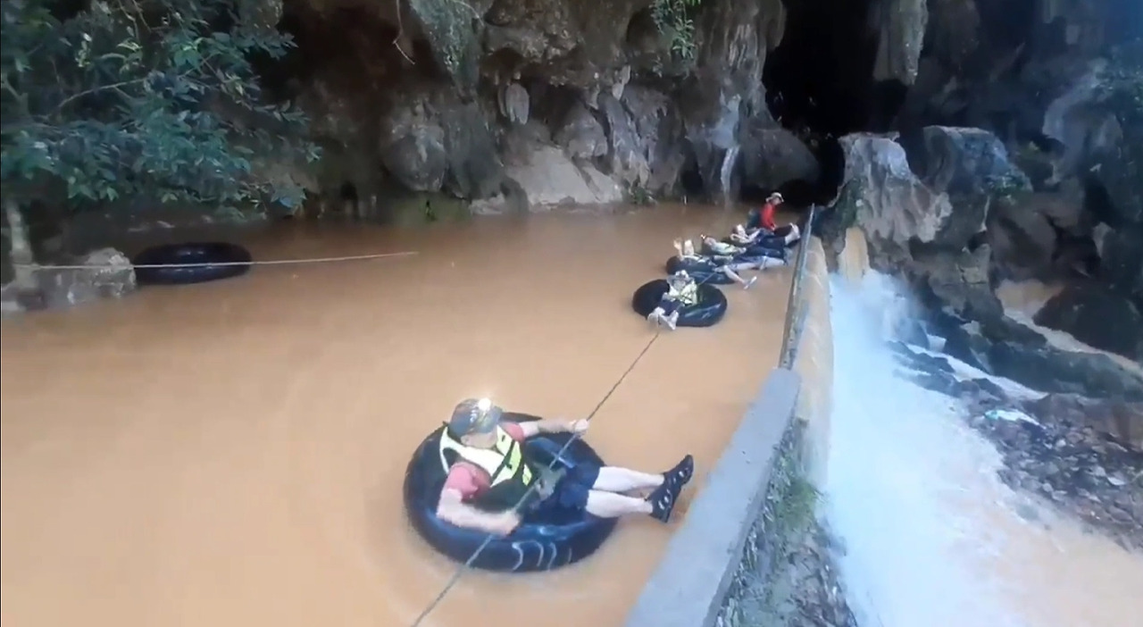 이어서 튜빙, 튜브 동굴 탐험 장소로 갔다. 튜빙은 튜브를 타고 동굴에 설치되어 있는 밧줄을 당겨 물을 거슬러 가면서 머리에 쓴 라이트로 동굴을 구경하는 것을 말한다. 동굴 밖으로 흘러 나오는 누런 물결이 도전을 주춤하게 한다. 사고 날지 모르기 때문에 앞 뒤로 이곳 경찰들이 직접 튜빙을 도와 준다는 말이 더 겁나게 한다. 그런데 튜브에 몸을 싣고 드러 눕자 말고 즐거운 도전의 시간으로 바뀌었다. 줄을 당기면서 시커먼 동굴을 따라 물결을 거스르는 재미에 금세 빠져버렸다.