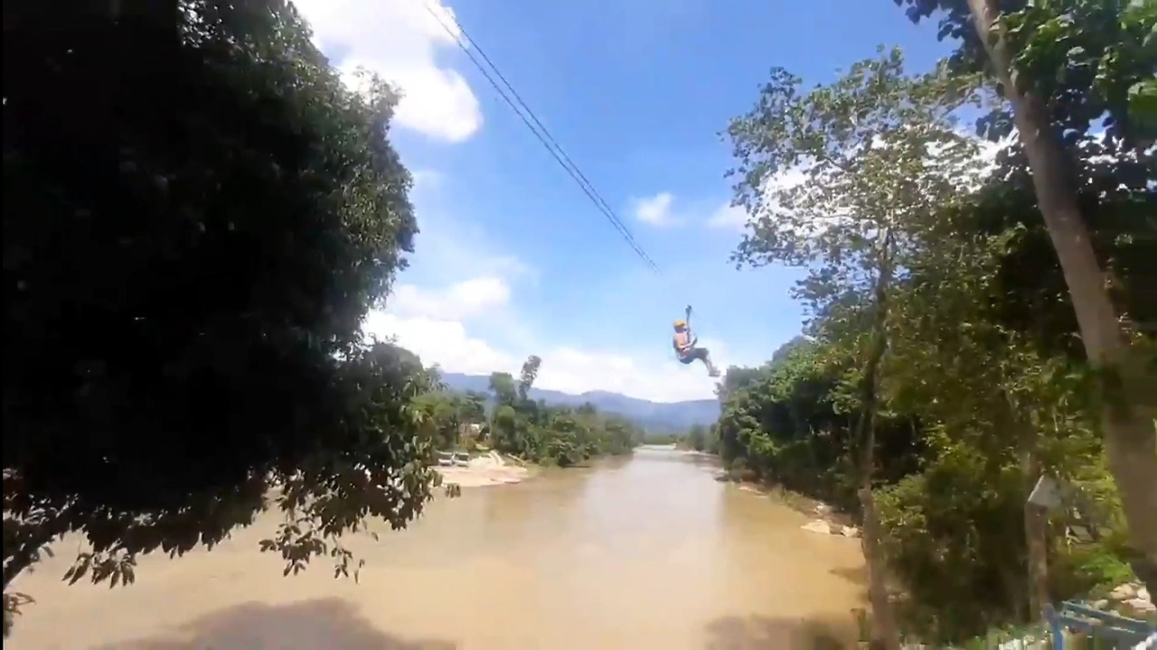 드디어 엑티비티 도시 방비앵으로 향했다. 방비앵은 이곳 산과 물의 도시로 중국의 계림, 우리나라의 가평과 같은 곳이다. 오전에 비가 왔다고 해서인지 메콩강의 지류인 쏭강이 황토색으로 변해 있었다. 저기서 카약을 하고 튜브를 타고 보트를 탄다고 생각하니 왠지 두려움이 밀려온다. 우리의 두려움을 눈치 챈 것인지 처음에는 이곳 석회 동굴인 코끼리 동굴로 데리고 갔다. 늘 느끼지만 석회 동굴 내부는 비슷비슷하고 생긴 모양을 어떻게 보느냐에 따라 다양한 이름이 붙는다. 무엇보다 좋은 것은 후덥지근한 더위를 식힐 수 있는 최적의 장소란 점이다. 그리 길지 않는 시원한 동굴을 관람하고 이동한 곳은 짚라인 타는 곳. 일행 중 짚라인에 도전하겠다는 사람은 우리 부부와 우리 나라 가면 나이 제한으로 탈 수 없기 때문에 꼭 타야겠다는 70대 여성 두 분. 8단계로 이루어진 짚라인은 그야말로 스릴 속의 즐거움 그 자체였다. 안전장치와 보호모자를 착용하고 난 뒤 높은 장소로 이동하여 짚라인을 탔는데 두려움은 잠시 금세 그 상황을 즐길 수 있었다. 군대 가서도 안해 본 것을 내 돈 내고 이런 모험을 즐기리라 생각했겠는가? 거의 마지막 단계에는 300미터가 넘는 긴 강을 엎드려 건넜는데 정말 즐거운 경험이었다.