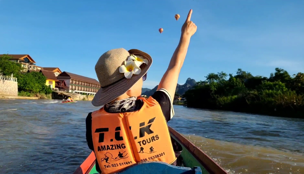그리고는 롱테일보트를 타러 갔다. 모터를 이용한 보트이므로 다른 것에 비해 이건 껌이었다. 시원한 강바람을 맞으며 물살을 가르며 나가는 동안 방비앵의 아름다운 계곡을 즐기면 된다. 방비앵을 둘러싼 산의 모습은 베트남의 하롱베이가 물 밖으로 나온 모습을 연출하듯 아름답다. 모터의 스피드를 즐기는 동안 절로 함성이 나온다. 강가에 물소떼가 유유히 놀고 있고, 하늘 위로 열기구들이 떠 다니고, 경비행기도 떠 다닌다. 기분 최고다.
