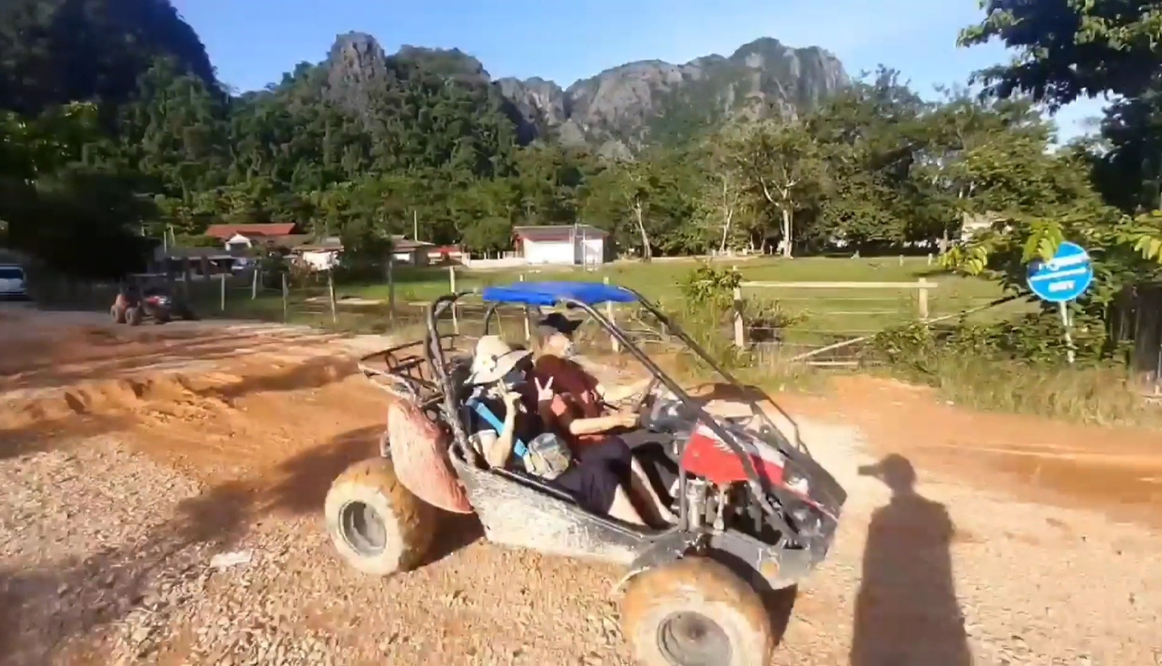 그리고는 버기라는 4륜 자동차를 이용해서 블루라군으로 향했다. 버기를 타겠다는 사람은 우리 부부밖에 없어 우리 부부 버기 앞에는 가이드가 버기를 타고 인솔했고, 우리 부부 뒤에는 버기 운영회사 직원이 만약을 대비해서 버기를 타고 이동해서 우리 부부만 버기를 탔지만 버기 3대가 이동했다. 한국에서도 타본 적 있는 ATB와는 차원이 달랐다. 30분이상 비포장 도로를 이동해야 하는데 도로 곳곳에 소떼들도 이동할 뿐 아니라 오토바이, 자동차가 함께 이동하기 때문에 방심할 수 없다. 게다가 도로 곳곳이 심하게 패여 있어 진흙이 튀기 일쑤고 먼지를 뒤집어 쓰는 것은 기본이다. 스릴을 즐기면서 이동하는 동안 좌우로 스치 가는 방비앵의 아름다운 시골 풍경도 눈에 가득 담으면서 이동했다. 중간에 2번 쉬면서 음료수도 먹고 포토타임도 가지게 해 줬다. 단지 심한 굉음과 먼지를 일으키기 때문에 이곳 주민들에게 미안하다는 생각이 들었다.