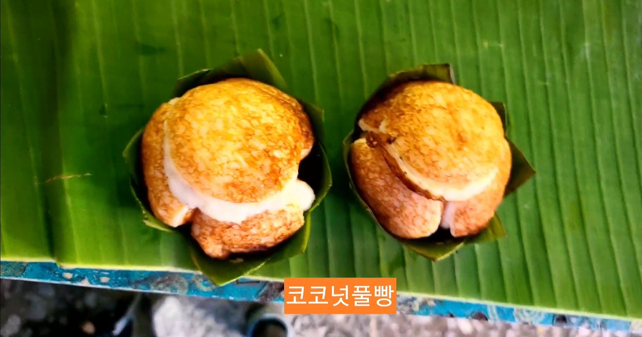 사원을 빠져 나가니 바로 메콩강이 나타난다. 메콩강변에 이 사원이 자리하고 있었던 셈이다. 이어서 이곳 아침 시장을 구경하러 갔다. 아침 시장에서도 전날 봤던 다양한 기념품과 의류들도 있었지만 아침 시장에는 먹거리가 많은 부분은 채우고 있었다. 가장 눈에 띤 것은 마치 바다 고기 같은 어마 어마한 크기의 메콩강 물고기들이었다. 전날 잡은 것이라 큰 눈을 가진 물고기가 금방이라도 푸더덕거리며 움직일 것 같다. 각종 과일, 채소류가 즐비했고 나무토막 같은 큰 죽순이 기억에 남는다. 각종 육류를 시뻘건 채로 탁자 위에 뒤엉켜 있는 모습은 우리 6,70년 대 시장 모습이었고, 모습은 완전히 다른 시커먼 옹기종기 꼬물거리는 식용 개구리도 팔고, 물소 물렁뼈와 물소 털이 그대로 있는 물소가족도 식용으로 팔고 있었다. 아침 식사 전이라 뭔가 입에 넣을 것을 이리 저리 살피는 중에 각종 튀김류는 호텔 식사를 위해 스킵하고 우리 나라의 풀빵과 같은 코코넛 풀빵에 시선이 머물렀다. 안에 팔 같은 앙꼬는 없었지만 부드럽고 고소한 맛은 일품이었다.