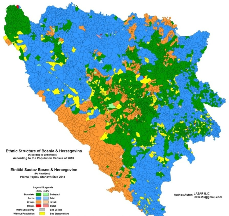 파랑:세르비아인, 녹색:보스니아인, 주황:크로아티아인