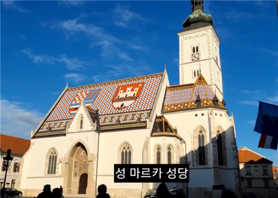 다음 관광지는 자그레브의 랜드마크라 할만한 성 마르코 성당이었다. 성 마르코 성당은 지붕 모습이 아주 예쁘다. 지붕 전체가 크로아티아 국기와 자그레브시 문양의 타일 모자이크로 되어 있어 이곳 젊은이들 사이에 최고의 결혼식 장소로 꼽힐 정도라 한다. 이 성당이 자그레브에서는 가장 오래된 성당(앞의 자그레브 대성당 건립연도가 1102년이라는데???)이라 하는데 이 성당의 스토리도 비슷하다. 1256년에 만들어져 지금까지 여러 차례 복구과정을 거치면서 여러 건축 양식이 혼합되어 오늘 모습에 이르게 되었다고 한다. 특히 이 성당 측면에는 예수님의 12제자 조각상이 있었는데 예술적 가치가 높아 남동유럽에서는 최고의 보물로 여긴다고 했다.