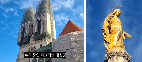 수리 중인 자그레브 성당과 성당 앞 성모상