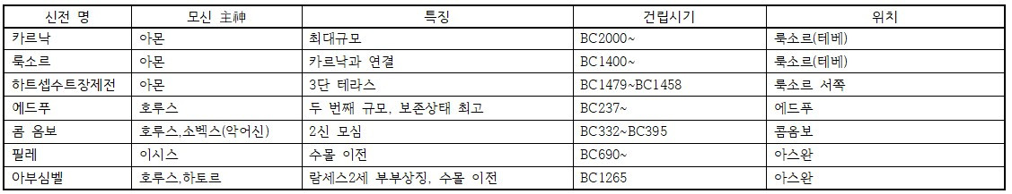 이집트에서 신전은 대부분 나일강의 남쪽 지방에 위치하고 있었는데, 가장 남쪽인 수단 국경 근처에 ‘아부심벨’ 신전이 있고, 아스완 댐 주변의 ‘필레’신전, ‘콤 옴보’ 신전, ‘에드푸’ 신전 그리고 룩소르에 ‘카르낙’ 신전과 ‘룩소르 신전’이 있다. 신전은 앞에서 말한 신들을 모시는 곳이다. 카르낙 신전과 룩소르 신전은 태양신 아문을 모시는 신전이었고, 아부심벨은 호루스와 하토르 신을, 필레신전은 이시스 신을, 에드푸 신전은 호루스 신, 콤 옴보 신전은 호루스와 악어 신인 소베크를 함께 모시는 신전이다. 이렇게 보면 현세의 왕으로 표현되는 신인 호루스 신을 모시는 곳이 가장 많다는 것을 알 수 있다. 그것은 파라오가 현세를 다스리는 신이 되고 싶었다는 것을 의미하기도 한다.