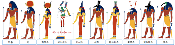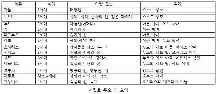 고대 이집트 역사를 이해하기 위해서는 그들이 섬긴 태양신의 계보를 먼저 알아야 한다. 그 계보에는 여러 갈래의 스토리가 존재하지만 대표적인 것 하나를 토대로 말하면 이렇다. 스스로 창조된 ‘아툼’은 누트(하늘의 신), 슈(공기의 신), 테프뉴트(습기의 신), 게브(땅의 신)를 낳는다. 이집트에서는 그리스 신화와 같이 다른 신화에서와는 달리 하늘의 신이 어머니, 땅의 신이 아버지가 된다. 하늘의 신 누트와 땅의 신 게브가 사랑하였으나 공기의 신 ‘슈’가 자신의 아내이며 습기의 신인 ‘테프뉴트’와 함께 이를 사이를 갈라 놓았지만 다른 신의 도움으로 결혼하여 4명의 자녀를 낳으니 그들이 바로 이집트 신전에 가장 많이 등장하는 오시리스, 이시스, 세트, 네프티스다. 이들에 대한 스토리는 다음과 같다.