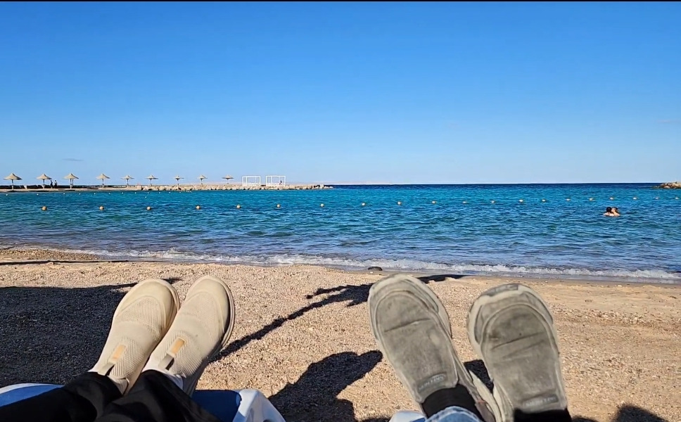 이곳은 겨울에도 따뜻해서 인기가 있기도 하지만 물가가 워낙 싼 곳이라 그렇기도 하다. 오성급 호텔 숙박비기 10만원 정도인데 우리들이 그 호텔에 묵는다는 표시인 팔찌만 보여주면 2박 동안 식사, 술과 음료를 모두 무료로 무한대로 즐길 수 있었다. 게다가 홍해 바다가 수정처럼 맑아 잠수선을 이용한 열대어 관광과 스노쿨링을 즐길 수 있었다. 푸르다 못해 눈이 시릴정도의 에머럴드 홍해였지만 우리가 묵을 때는 이상 기온으로 인한 10도 내외의 기온에 바람이 심하게 불어 춥다고 느껴져 몸을 담그기는 어려웠다. 그래서 주로 호텔에서 시간을 보냈다. 때마침 맞은 결혼 38주년을 기념하면서....