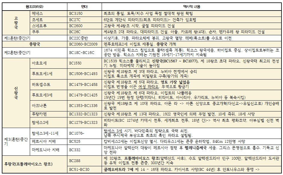 BC3150년에 메네스 왕이 최초로 상하 이집트를 통일하여 세운 왕국을 세운 후(제 1왕조) 후 제 32왕조 클레오파트라가 패하는 BC30년까지 3,120년 간 지속되었다. 고대 이집트는 고왕국(1중간기), 중왕국(2중간기), 신왕국(3중간기), 후왕국시기로 나눠지는데, 중간기는 왕조의 힘이 약해져 혼란한 시기를 겪게 되는 기간을 말한다.
