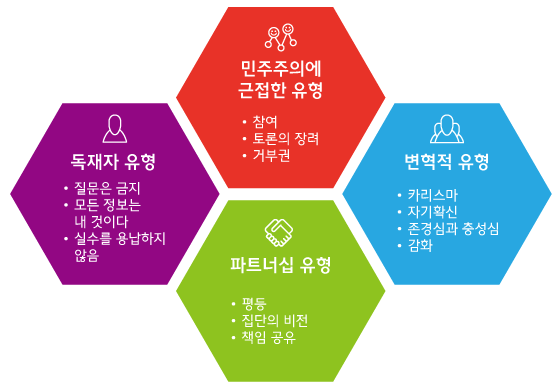 반면, 민주형리더십이나 비전을 제시하고 따르게 하는 변혁적 리더십 그리고 머슴 리더십이라고 표현할 정도로 구성원들의 소리를 경청하고 존중하고 도와주는 서번트(섬김)리더십과 같이 현대 나온 리더십들은 한결 같이 리더의 희생을 전제로 한다. 당연히 일사불란한 의사결정이 될 수가 없다. 구성원들 하나 하나를 인정하고 그 구성원들로부터 의견을 끌어내서 의사결정을 하기 때문이다.