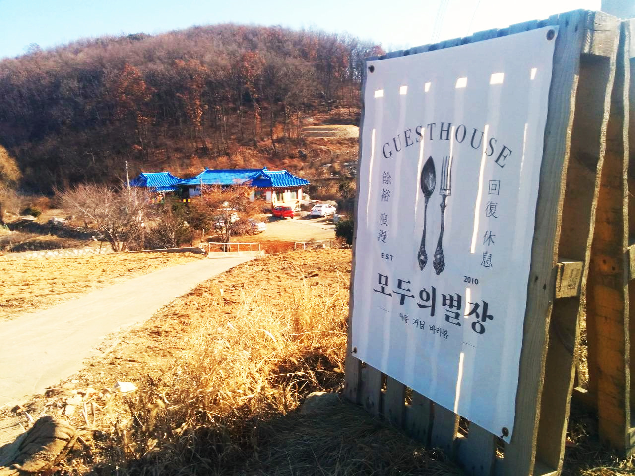 '모두의 별장'은 강화도에 위치한 게스트하우스이다. 서울에서 차로 한 시간 거리. 조용한 시골 마을에 위치한 공간이었고, 생김새도 시골집 그 자체였다. '왜 이런 곳에 게스트하우스를 만들 생각을 했을까?' 주인장의 생각이 궁금해졌다. 주변이 모두 논밭이었고 편의점도 차로 5분은 가야 할 정도로 고립된 공간인데.