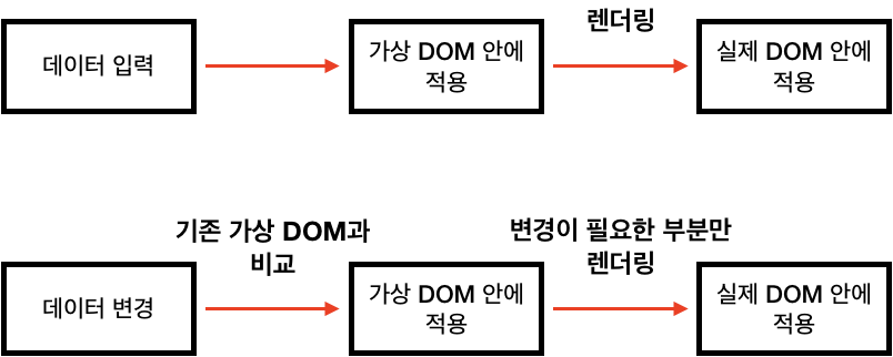 리액트에서 사용되는 가상 DOM은 자바스크립트 메모리에만 존재한다. 만약 데이터를 추가하거나 변경하는 작업을 진행하면 리액트는 가상 DOM에 먼저 적용하여 비교한 후 변경이 필요한 부분만 실제 DOM에 반영한다. 결과적으로 리액트는 꼭 필요한 부분만 반영하고, 가상 DOM과 실제 DOM을 같게 만든다.