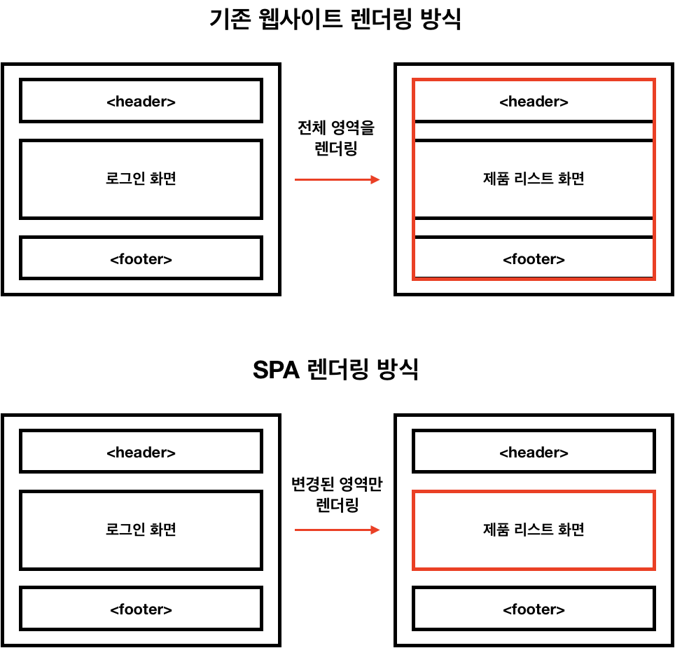 정리하면 페이지를 변경할 때마다 서버에 요청하는 것이 아니라 최초 접속 시 한 번에 페이지 전체를 불러온 다음 변경이 필요한 영역만 변화를 주는 것이 SPA이다. 리액트는 SPA 방식에 특화된 '라이브러리'이다. 위에서도 언급했듯이 실제 변화가 일어나는 부분에만 변화를 주기 때문에 쓸데없는 리소스가 들어갈 일이 없다.