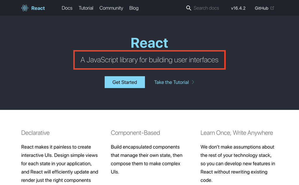 결론부터 얘기하면 리액트는 라이브러리이다. 이는 리액트 공식 사이트 메인 화면에도 적혀있다.
