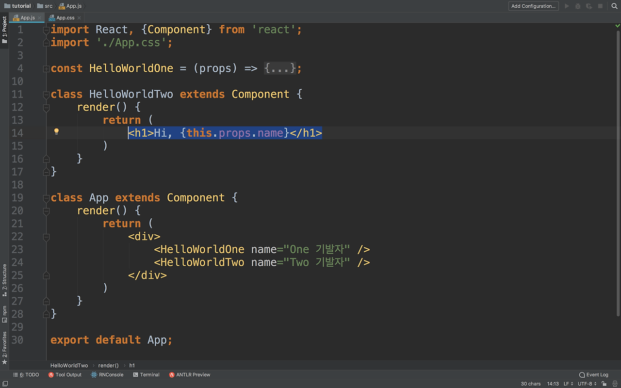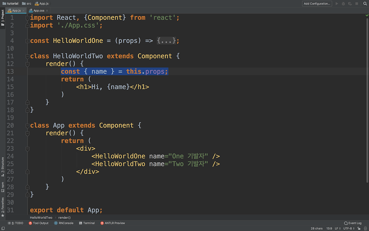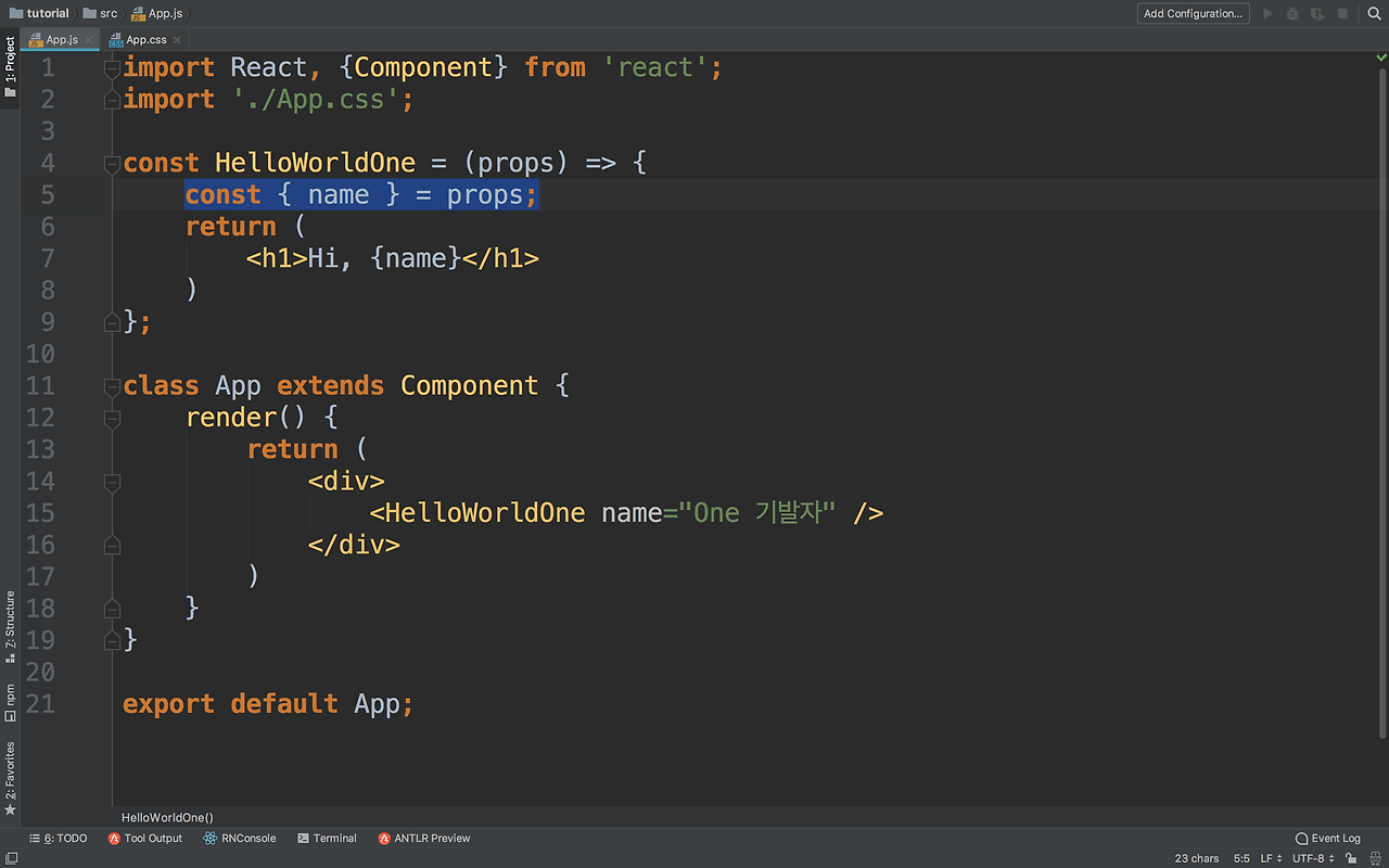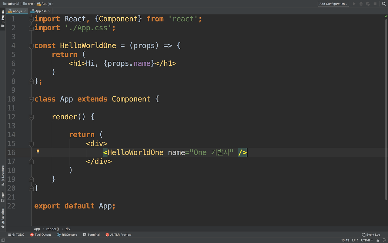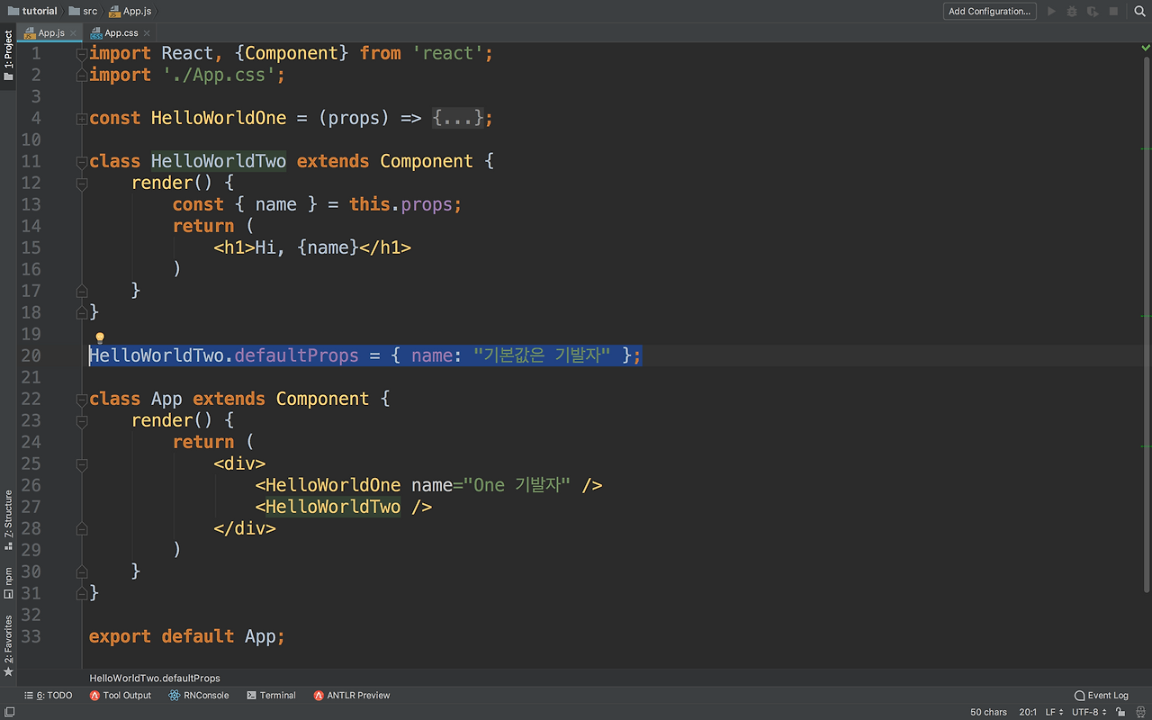 먼저 함수형 컴포넌트로 props를 받아오는 방법을 살펴보자. HelloWorldOne 컴포넌트를 생성한 후 부모 컴포넌트에서 전달받을 props 값을 {props.name}과 같은 형식으로 작성한다. 부모 컴포넌트에서 "One 기발자"는 큰 따옴표로 감싸져 있다.