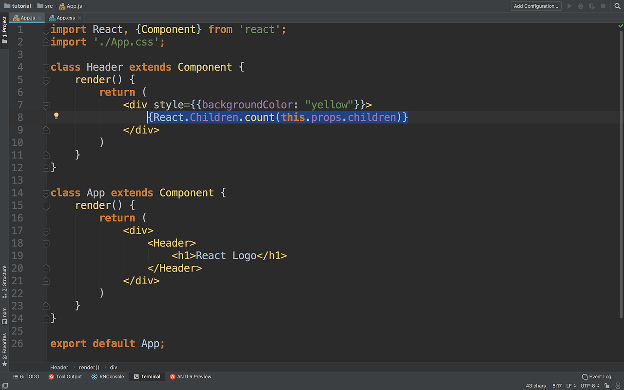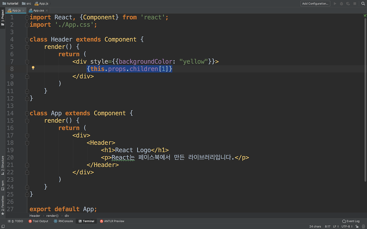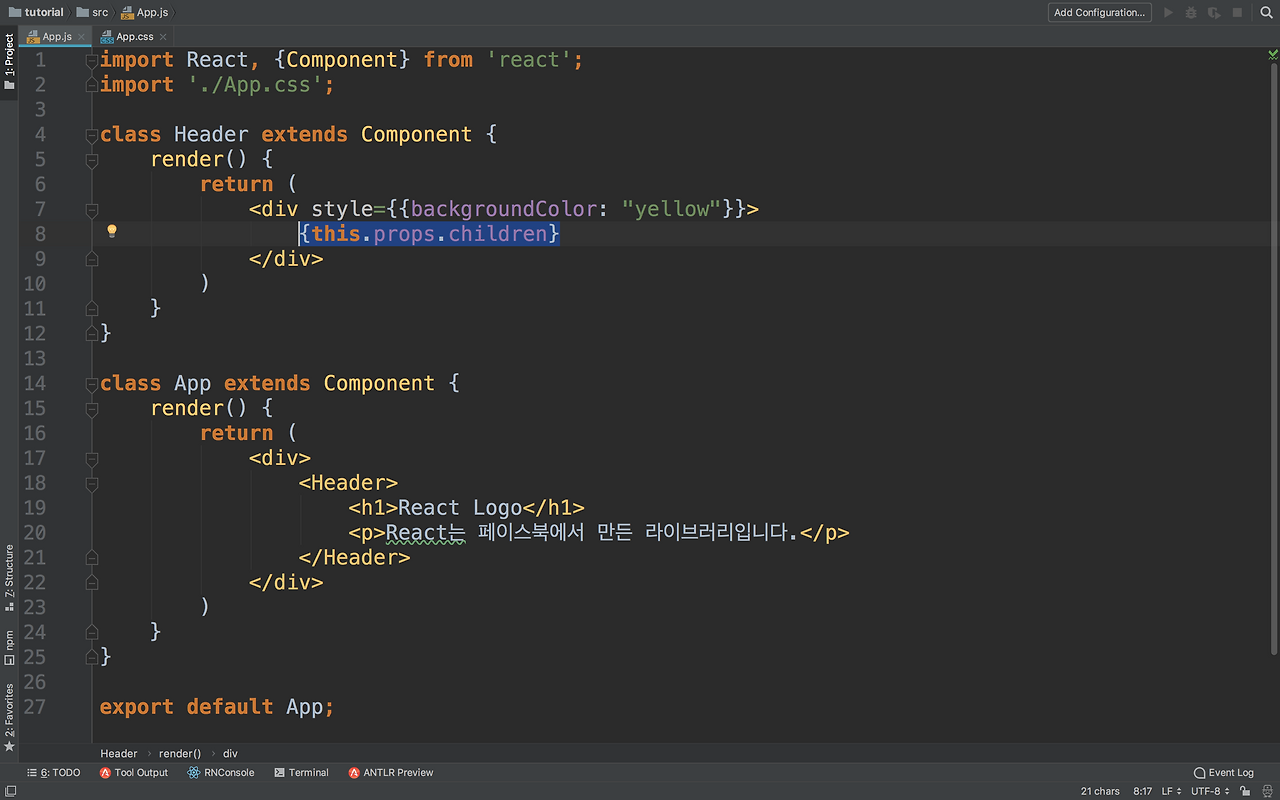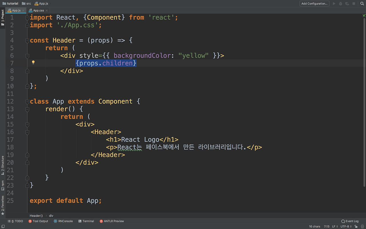 props 는 기본적으로 children 속성을 가지고 있다. children 속성은 컴포넌트 안의 모든 자식을 {props.children}으로 렌더링할 수 있다. 보통 컴포넌트를 작성하면 <Header /> 안에 작성하는데, {props.children}을 사용하면 <Header></Header> 안에 자식 태그(?)를 전달할 수 있다.