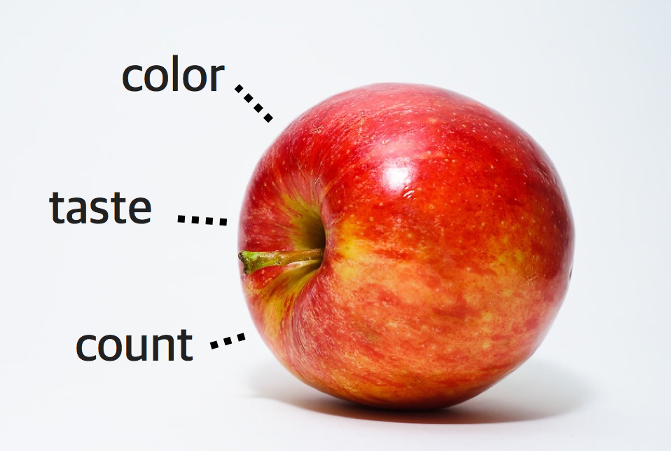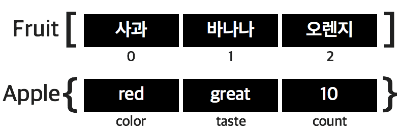 Object 는 Array 와는 달리 "사과"처럼 특정 요소에 대한 구체적인 정보를 담는 그릇이라고 생각하면 됩니다.
