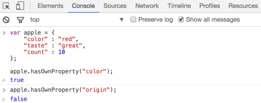 만약 특정 property 의 존재 유무를 확인하고 싶다면 hasOwnProperty() 를 사용하면 됩니다. 이때 결과값으로 property 가 존재한다면 true, 없다면 false 를 반환합니다.