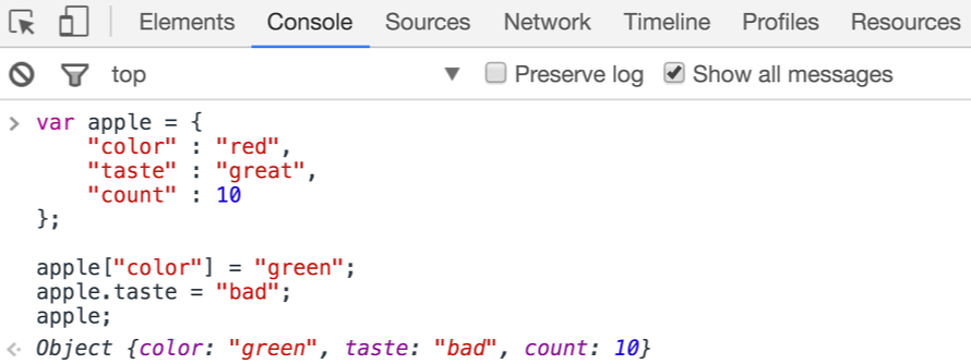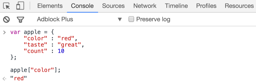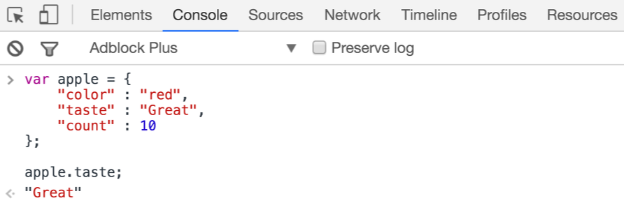 Object 를 생성하는 방법은 위 코드처럼 {} ( 중괄호 ) 안에 생성된 Object 와 관련 있는 항목들을 나열하고, 각각의 항목들에 해당하는 정보를 담으면 됩니다. 위 코드에서 "color", "taste", "count" 와 같은 항목을 property, "red", "great", 1 같은 정보들을 value 라고 얘기합니다. 정리하자면 Object 는 {} 안에 property 와 value 로 구성되어 있는 데이터 타입을 의미합니다.