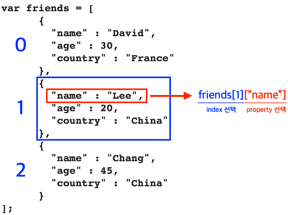 friends[1]; // { "name" : "Lee", "age" : 20, "country" : "China" } 출력