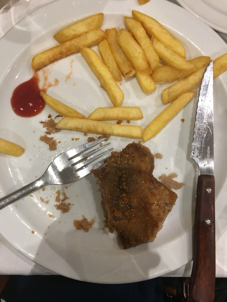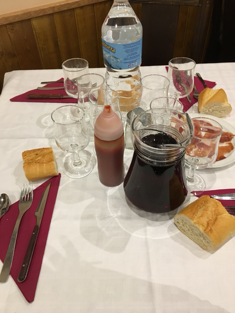 꿈을 꾸는 것처럼 급하게 나와서 예약된 식당에서 저녁식사를 했다. 첫 스페인 현지 음식이라 좀 긴장했는데, 싸구려 상그리아에 하몽, 빵, 계란과 버섯을 볶은 스크램블에그 비슷한 요리와 얇은 돼지고기를 튀긴 커틀렛이 나왔다. 나는 매우 입이 검소한 사람이라 불만 없이 잘 먹었다. 점심 때와 똑같이 할머님들과 앉았는데 이분들 여행 많이 다니신 듯 음식 힘들어하고 불평하지 않으시고 잘 드셨다. 체력도 좋으시고. 처음으로 스페인의 식사를 하며 느낀 점은 안 짜다! 놀랍게도! 독일과 미국에서 느꼈던 나트륨의 폭격이 스페인 음식에는 없다. 하몽도 분명히 짠 음식이긴 하지만 미치게 짜지는 않아서, 독일의 소시지처럼 다른 맛은 하나도 느끼지 못하게 할 정도가 아니었다. 그리고 재료 중심의 느낌? 감자튀김에도 케첩을 뿌려주지 않아서 좋았다.