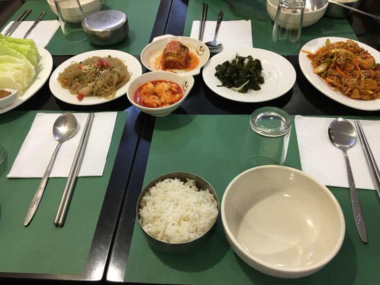 멋진 버스를 타고 처음 간 곳은 현지의 시간에 따라 밥집이었다. 점심이 준비되어 있는 한식집의 이름은 '고향맛'이었고, 메뉴는 제육볶음과 잡채, 미역 무침과 로메인(상추 대용), 된장찌개(국물이 좀 많아서 처음에 국인 줄)였다. 자유여행과는 달리 함께 식사할 때 안 먹어 두면 망한다~ 라는 다짐을 할 것도 없이 사람 잡는 장시간 비행에도 식욕은 줄지 않았기 때문에 맛있게 먹었다. 잡채가 좀 짠 것 외에는 그럭저럭 맛도 있었고. 나보다 앞서서 가까운 회사 동료와 오빠가 유럽 패키지 여행을 다녀왔기 때문에 '다른 일행과 밥을 먹는 일'에 대해 마음의 준비도 되어 있었다. 28명의 일행은 함께 온 가족들을 중심으로 '조'로 짜서 인원 체크를 했는데, 언니와 나는 다른 연합 없이 단독조인 마지막 7조가 되었다. 이 말 뜻은 앞으로 우리 식탁에는 항상 다른 사람이 함께하게 되었다는 뜻. 첫 식탁 동료는 자매 셋이서 여행을 온 일행 중 위의 두 언니(대략 60대 이상)셨다.