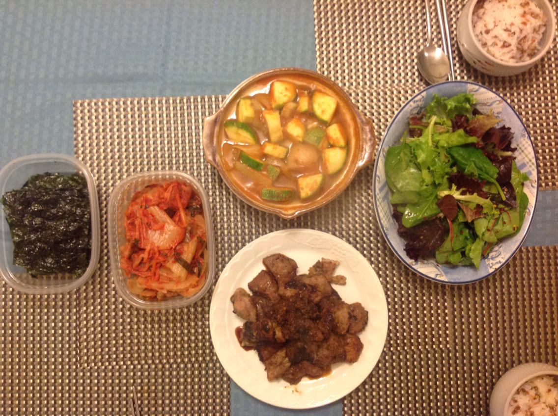 어젠 월마트에서 뼈가 조금 붙어 있는 돼지를 샀다. 미씨유에스에이에서 검색해서 미국에서 산 첫 돼지는 맨 먼저 고추장찌개를 끓였다. 마침 배달하는 한국 식품 마켓에서 쌀을 살 때 같이 주문했던 애호박으로 호박전, 고추장찌개, 된장찌개에 알뜰하게 썼다. 그리고 간장으로 갈비 양념을 해서 구이를 만들었다. 갈비 양념을 할 때 좀 달라진 걸 느끼긴 했다. 일단 간장(전 주인이 남기고 간 것)을 지나치게 많이 쓸까 봐 긴장하며 만들었다. 다시 사러 나가기 귀찮으니까. ㅎㅎ 크로거에서는 두부도 살 수 있다고 하던데, 항상 느끼지만 난 검색력이 거지 같다.