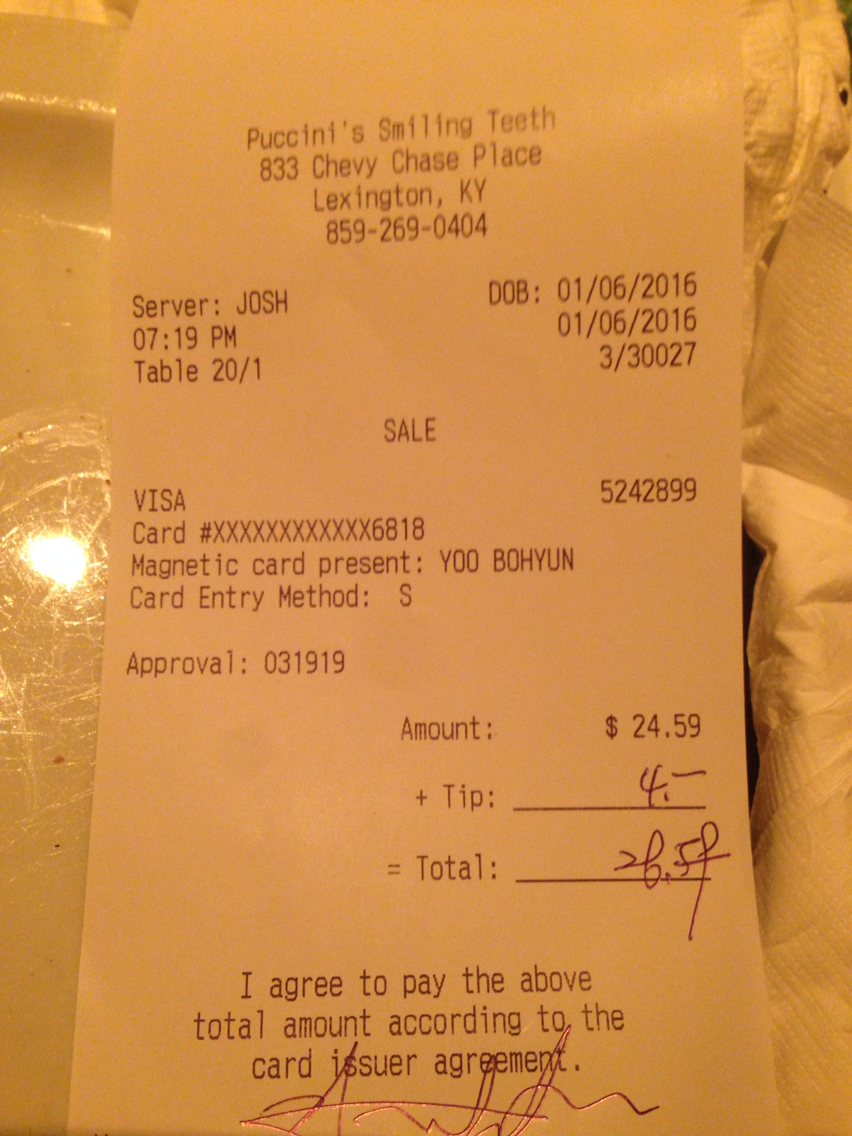 2) 현금이 적절하지 않을 때 : 예를 들면 식대는 약 70불, 팁은 약 15불인데 지폐가 백불이라면 백불을 빌지에 꽂아 웨이터에게 준다. 그러면 그가 빌지에다가 식대만 계산한 거스름돈 30불을 꽂아서 줄 것이다. 그러면 15불만 그 빌지와 함께 테이블 위에 두고 나오면 된다. (이거 할 때 진짜 떨렸다. 혹시 30불 전부 팁으로 챙겨가는 게 아닌가 하고. ㅠ_ㅠ)